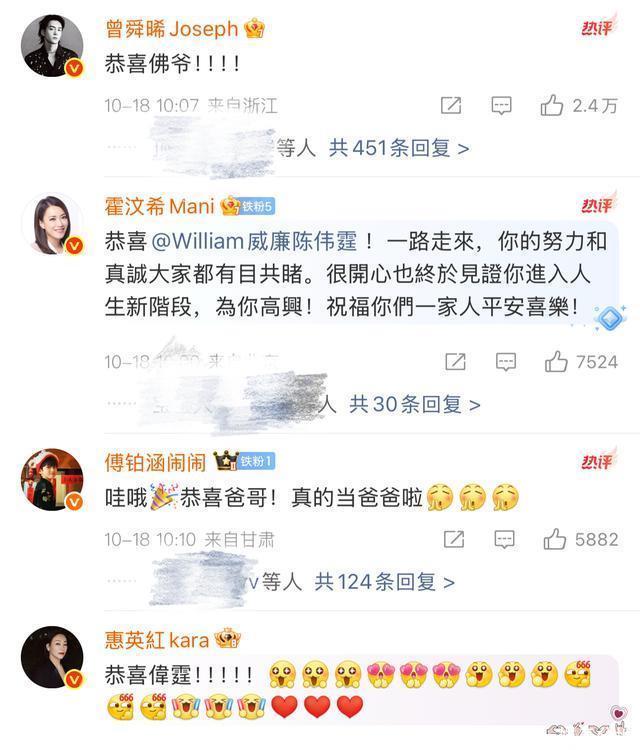 ?????? 陈伟霆和何穗官宣生子后,霍汶希、曾舜晞、惠英红等不少圈内好友以及两人粉丝都送上了祝福。最近在《许我耀眼》中扮演陈伟霆儿子的小演员傅铂涵也幽默祝福道:“恭喜爸哥!真的当爸爸啦!”还有网友评论两人恋情低调,“闷声干大事!”