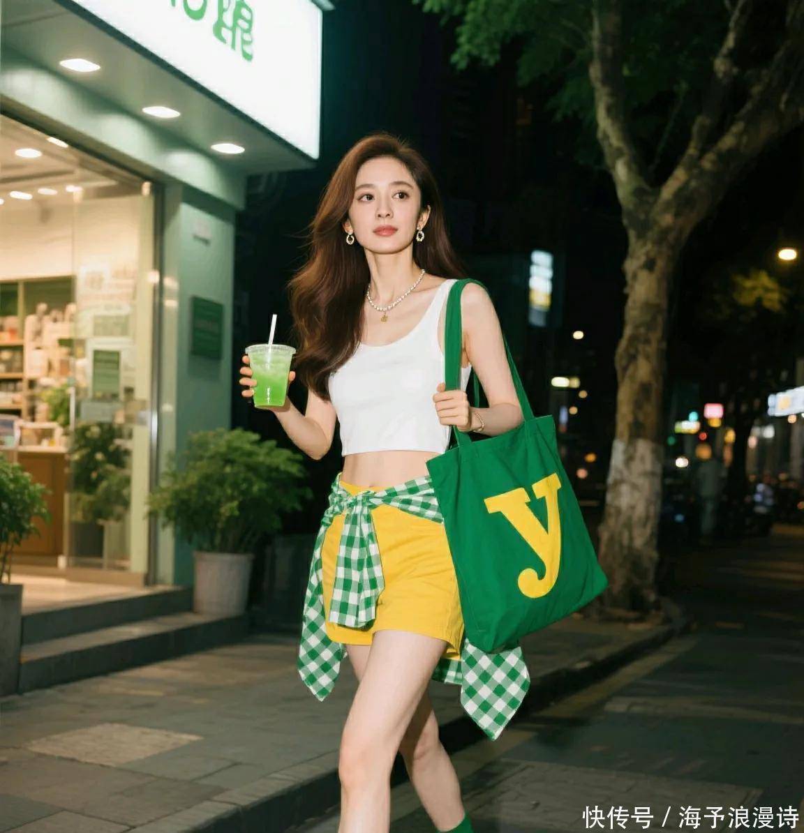 出生于 1986 年的杨幂,在时尚穿搭上的造诣总是能给人带来新的惊喜。当她身着这套多巴胺穿搭出现在街头时,纤美的身姿被衬托得愈发迷人,每一处穿搭细节都透露出她对时尚的精准把握。白色短款背心利落又显身材,黄绿配色的下装组合大胆又充满夏日气息,绿色格纹衬衫系在腰间的穿法别致又时尚,搭配同色系的袜子和帆布包,整体造型既有着街头的活力感,又有着女性的优雅身姿,走在哪里都是焦点般的存在。