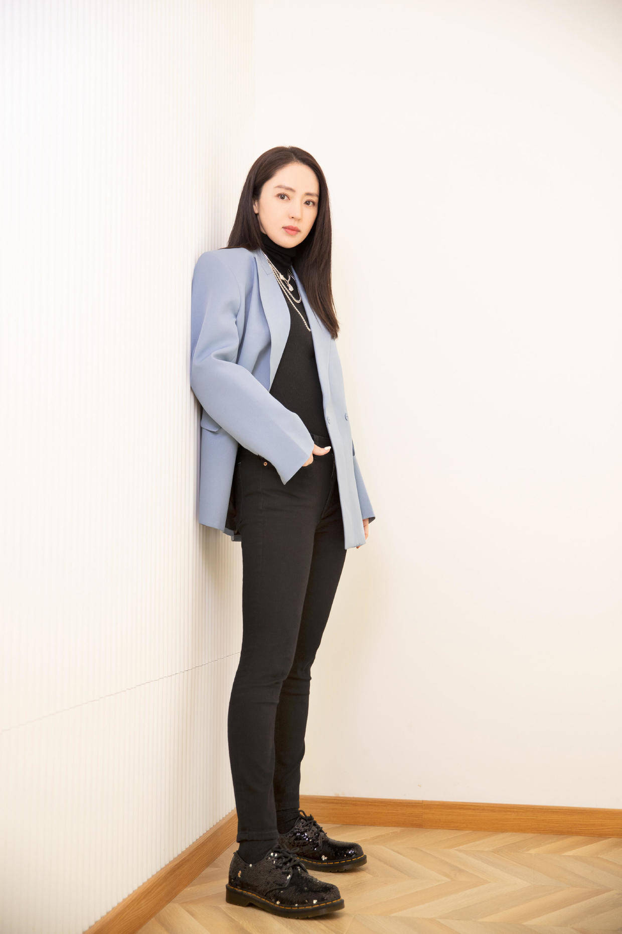 内搭挑选的是一件高领针织衫,这种款式在秋冬季节尤为适宜,它能修饰颈部线条,柔软的针织面料也能带来舒适体验。内搭还带有竖条纹暗纹,不仅丰富了层次,还具有修饰身材、显高的作用。