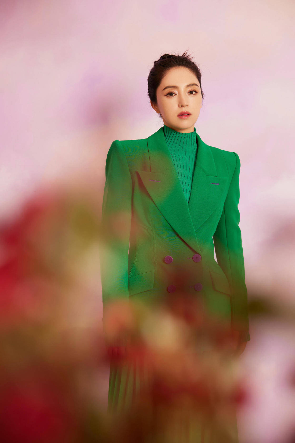 董璇这套穿搭整体以绿色作为主色调,而且是偏向深调的绿色,其饱和度颇高,因而显得格外惹眼,如同红色一般,能让你轻松成为人群焦点。全身采用同一色彩,更能强化整体风格,增添洋气感,还有不错的显白效果,所以大家别畏惧尝试。