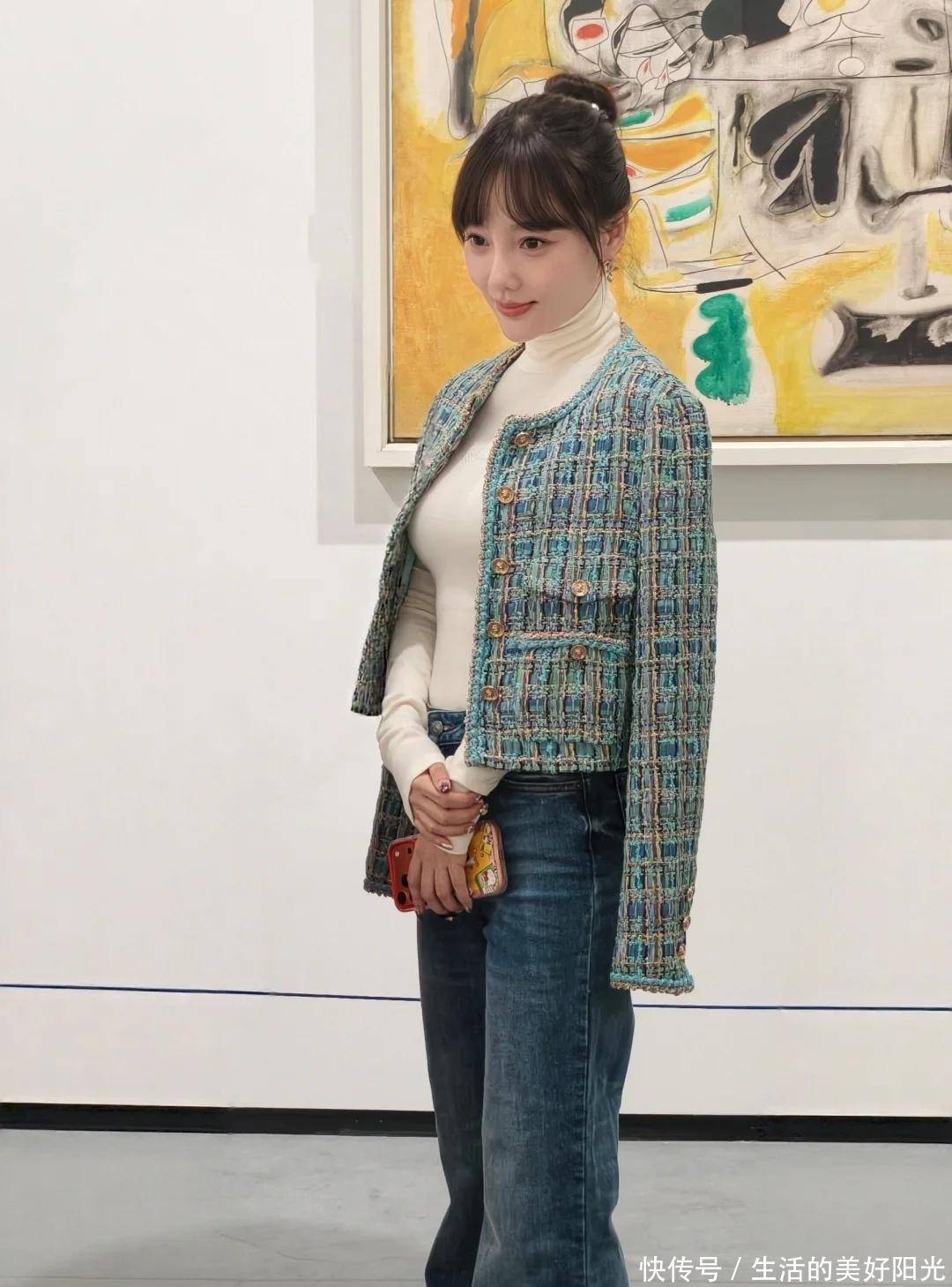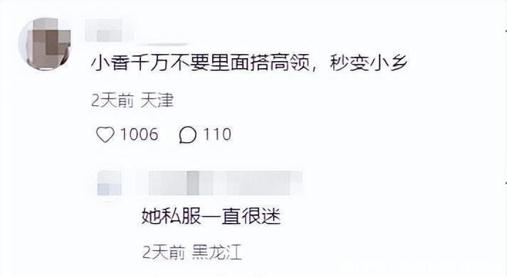 除了状态,穿搭也成了讨论焦点。蓝绿色的小香风,本应该显得她整个人优雅精致,可是突出的高领毛衣却让人出戏,被不少网友吐槽“太俗”。