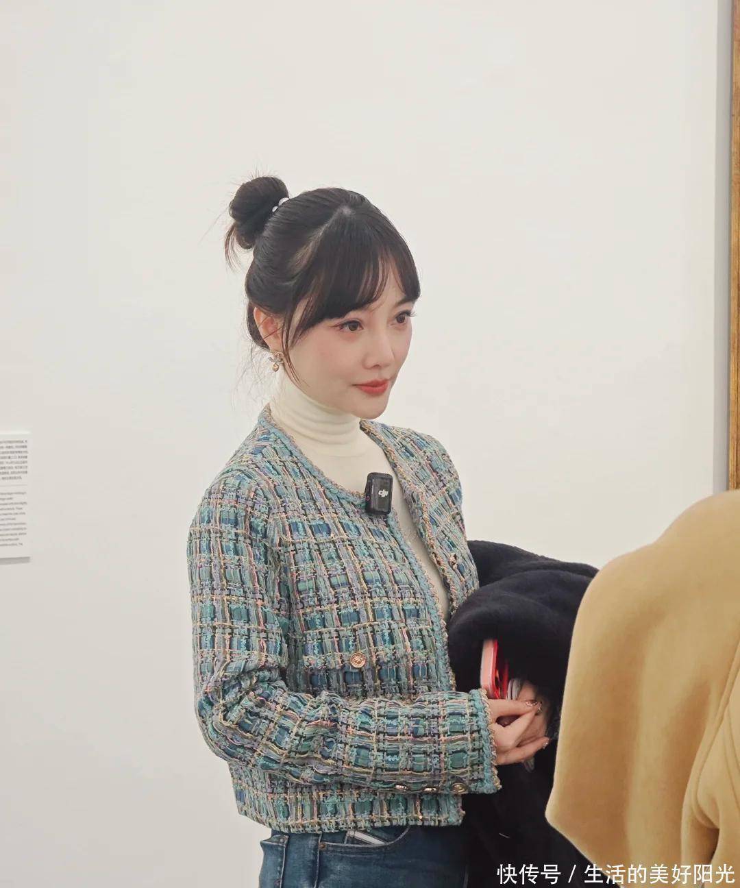 高领内搭遮住了纤细的脖颈,显得有些臃肿;小香风外套的版型不够利落,再加上突兀的丸子头,反而凸显了面部的浮肿感。