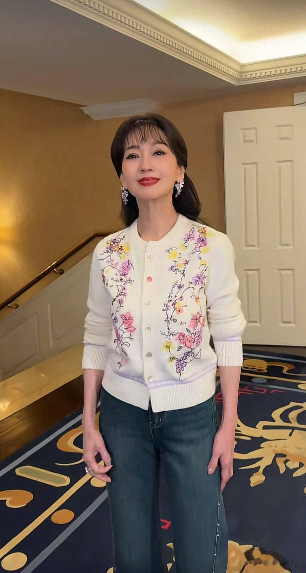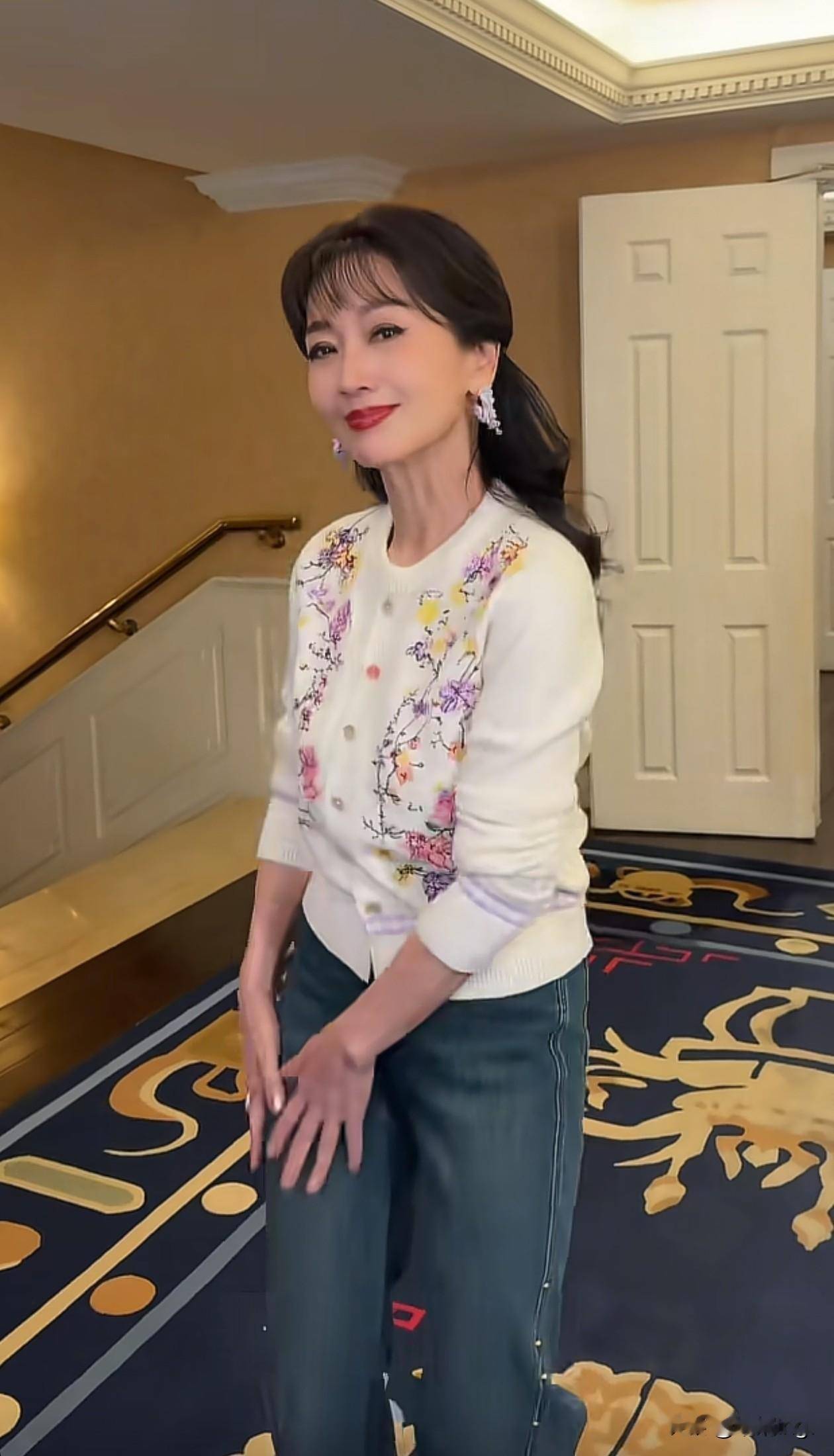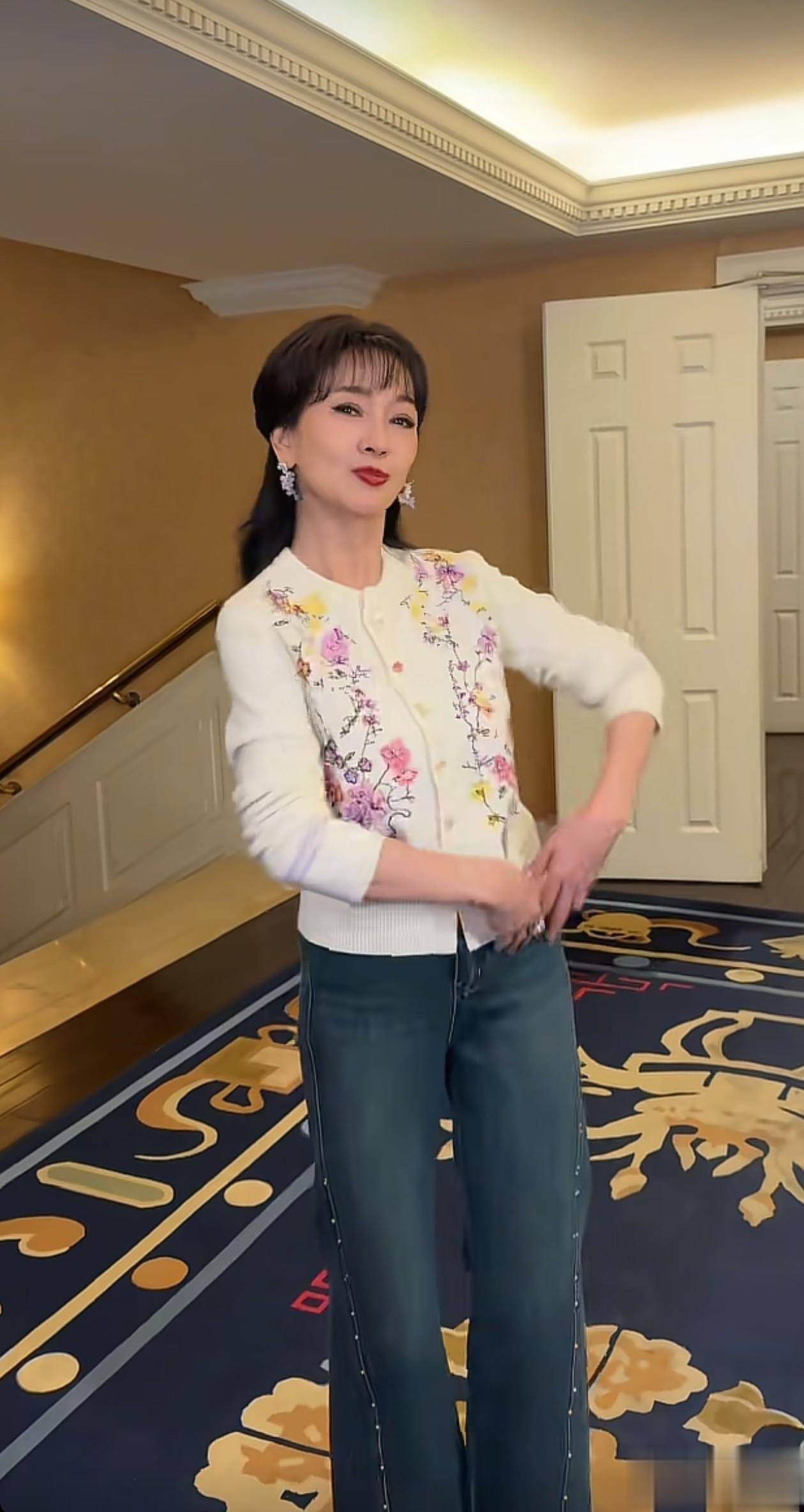 女神赵雅芝首次跳手势舞,起初画面里只有她自己,上半身穿了一件小开衫,面料以白色为底色,在前身融入了图案,其中有黄色、粉色、紫色,结合在一起养眼又高级。