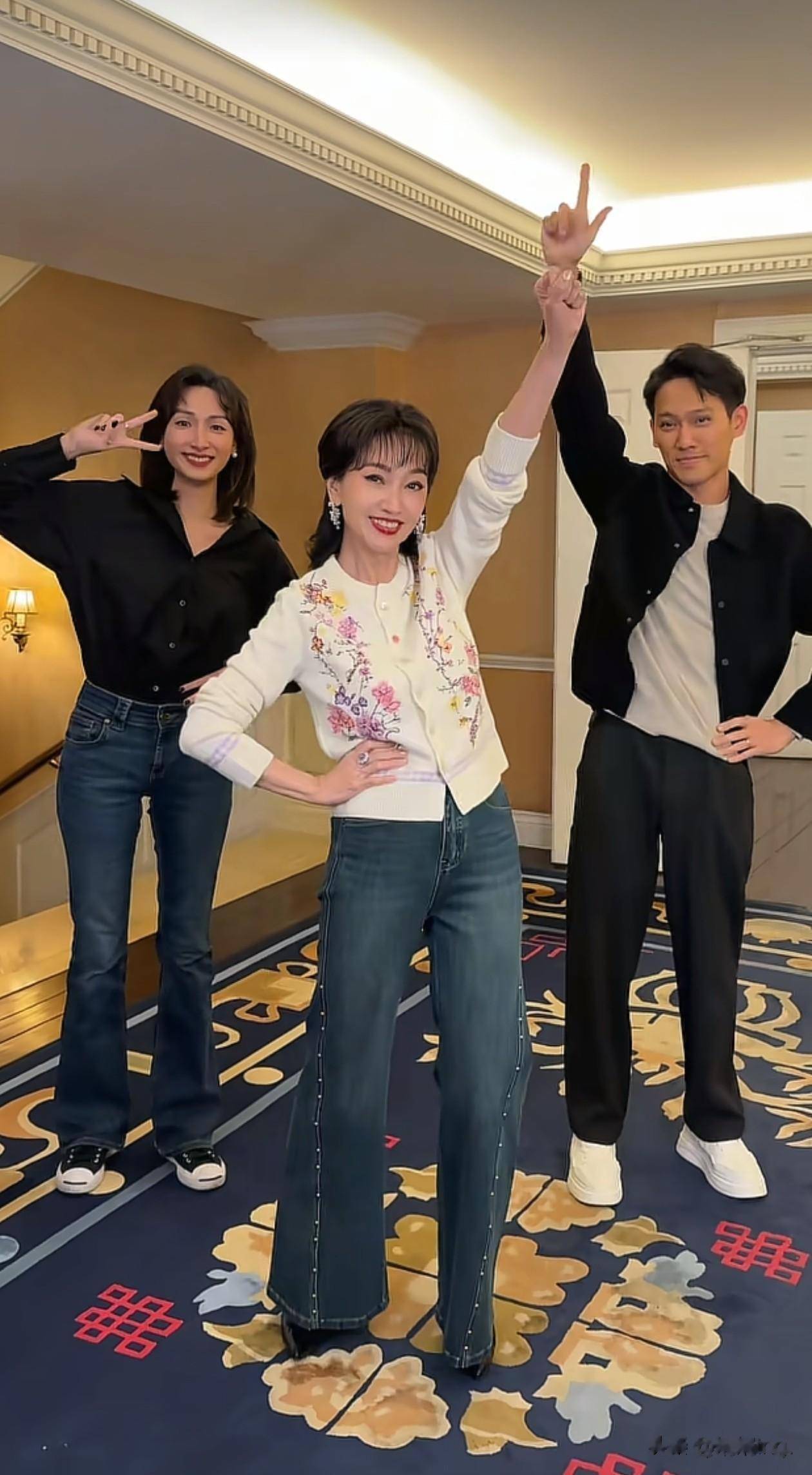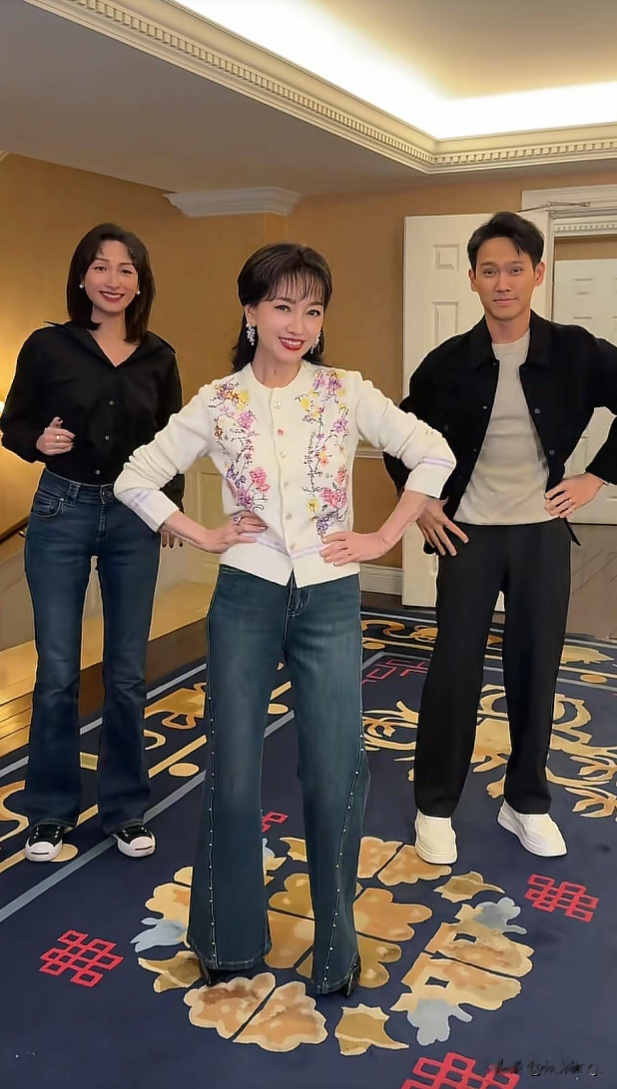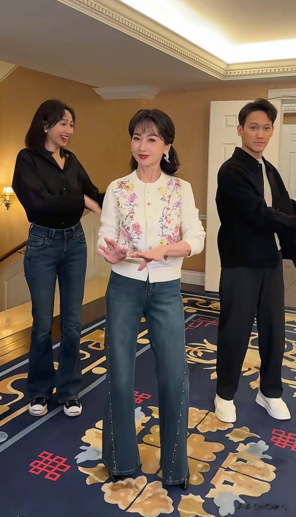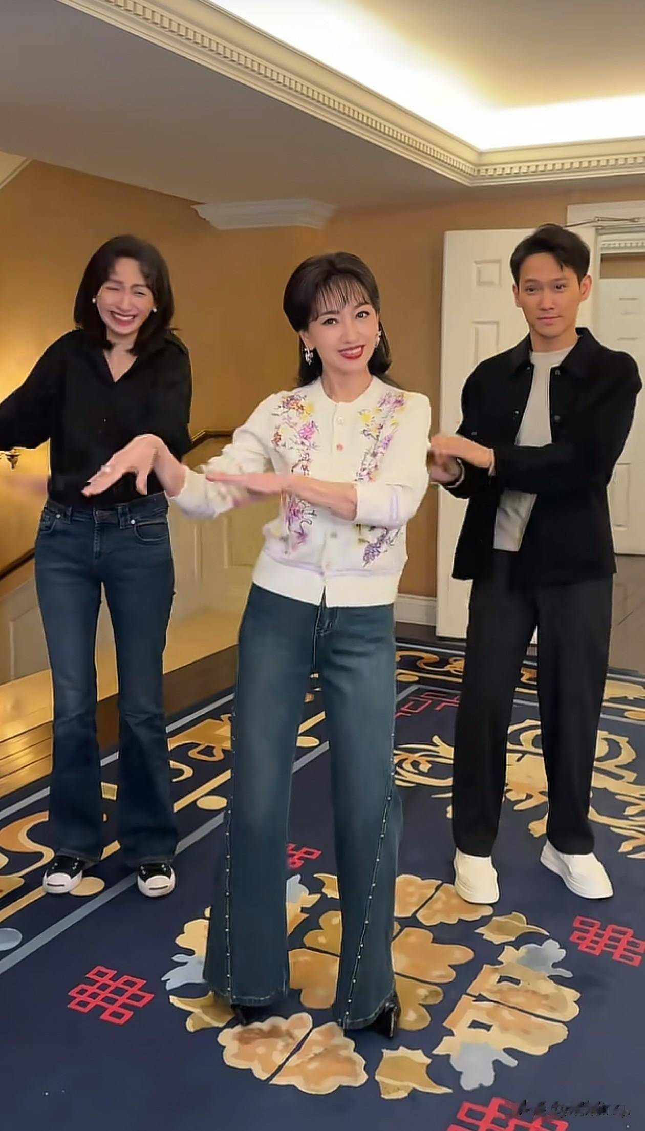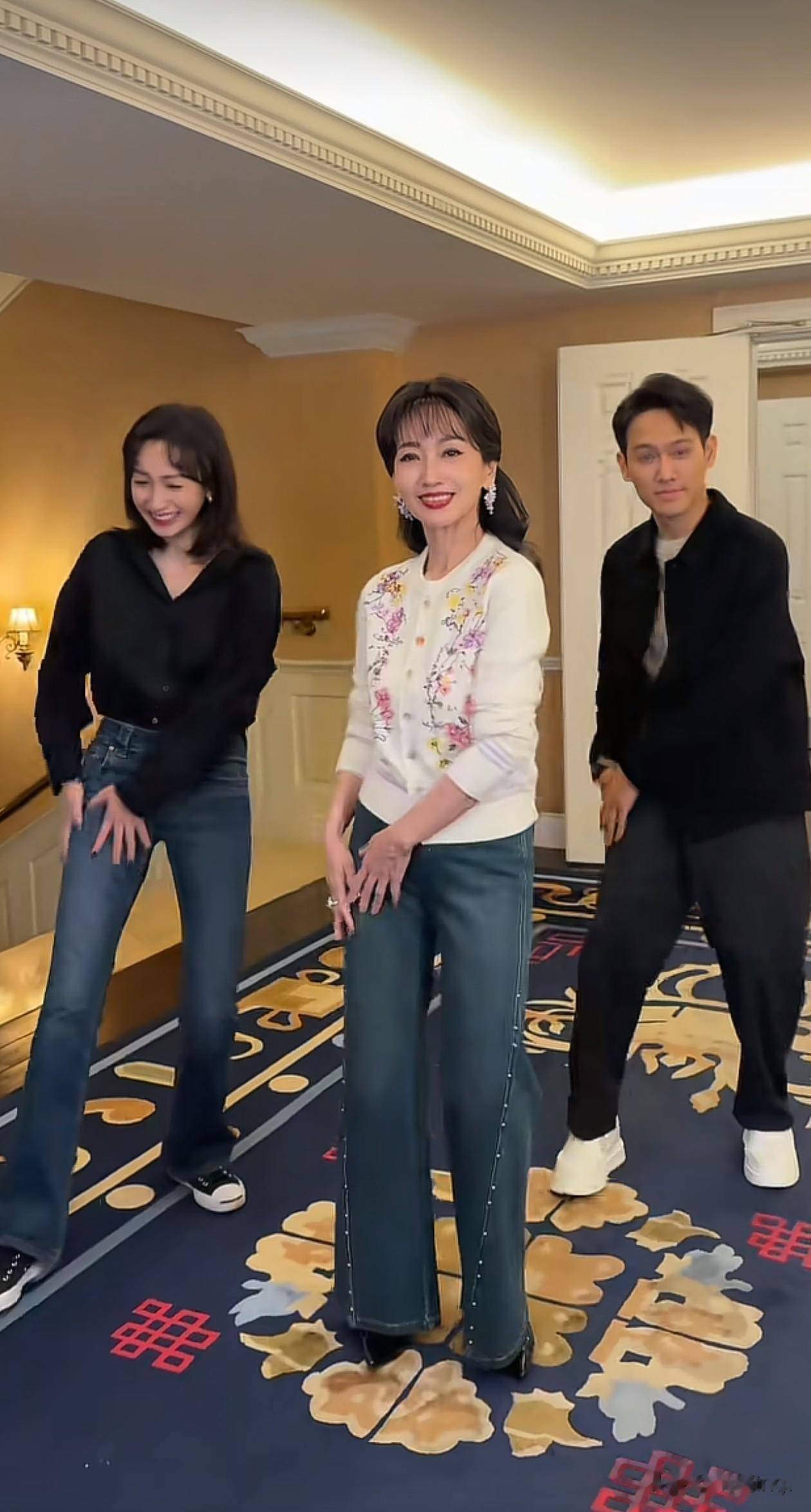 72岁赵雅芝看着岁,三人跳舞氛围也好欢乐。