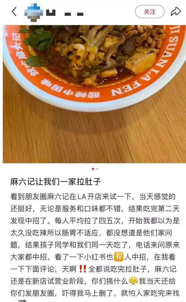 ?????? 麻六记洛杉矶店于?????? 10日正式开业?????? 。?????? 开业后,多位消费者在社交平台发帖,?????? 称自己和家人在用餐后出现:?????? 恶心、头晕?????? 上吐下泻?????? 腹痛、肠胃不适?????? 不少顾客因此向洛杉矶公共卫生局提交举报,?????? 认为餐厅存在食物污染问题。