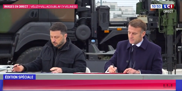 乌克兰总统泽连斯基与法国总统马克龙签署军购意向书。图源:法媒视频截图