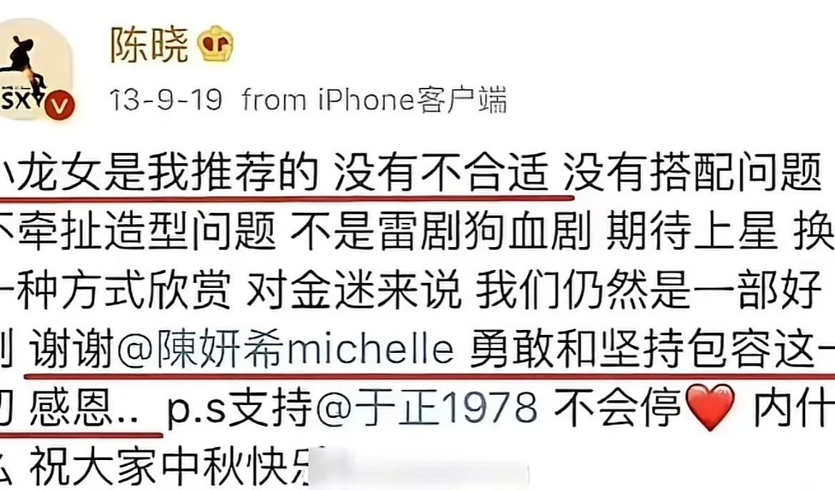 陈妍希饰演的小龙女因造型被称为“鸡腿头”,遭全网嘲讽。关键时刻,陈晓站出来力挺:“人选是我定的,我相信她就是最合适的?!?/p>