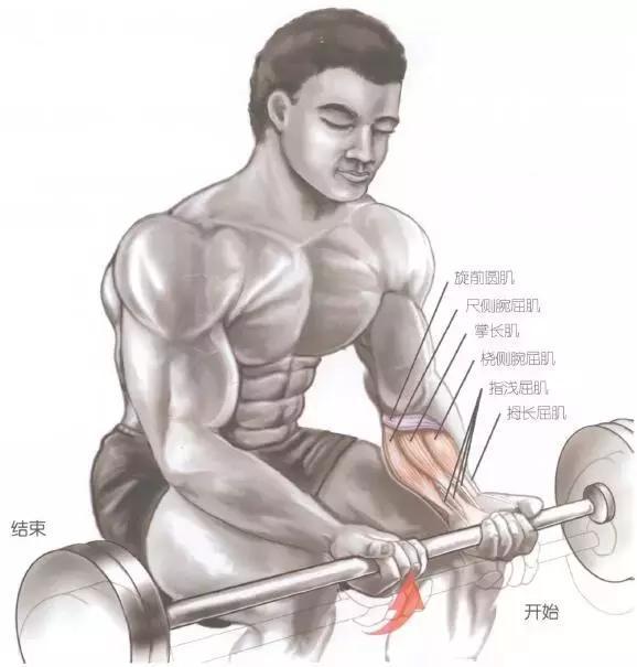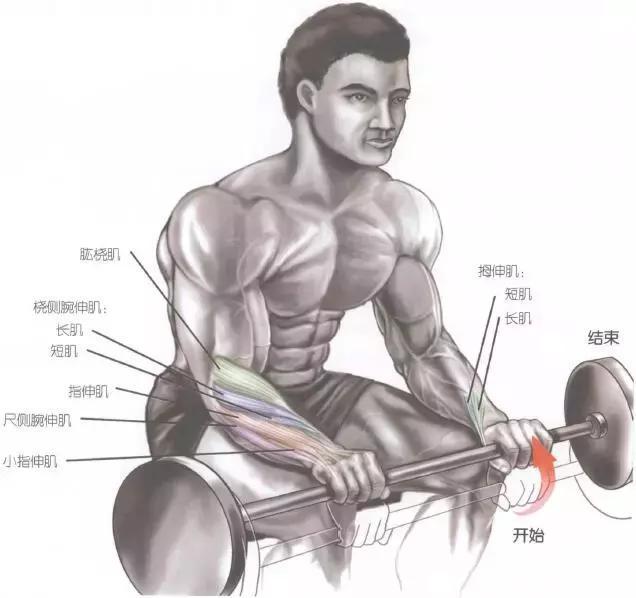 1.坐姿,前臂放于大腿或长凳上,正手抓握杠铃,腕关节被动屈曲;