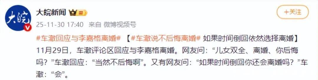 离婚两个月后,2025月底,车澈在社交平台评论区回应网友提问时,彻底撕碎了这份体面。当被问到是否后悔离婚时,他回答:“不后悔啊”。追问如果时间倒流是否还会离婚,他更简单地回应:“会”。这番直白言论引发了舆论热议。有人批评车澈“没给李嘉格留一丝体面”,也有人认为他“真性情”。但更多人开始重新审视这段看似美好的婚姻。