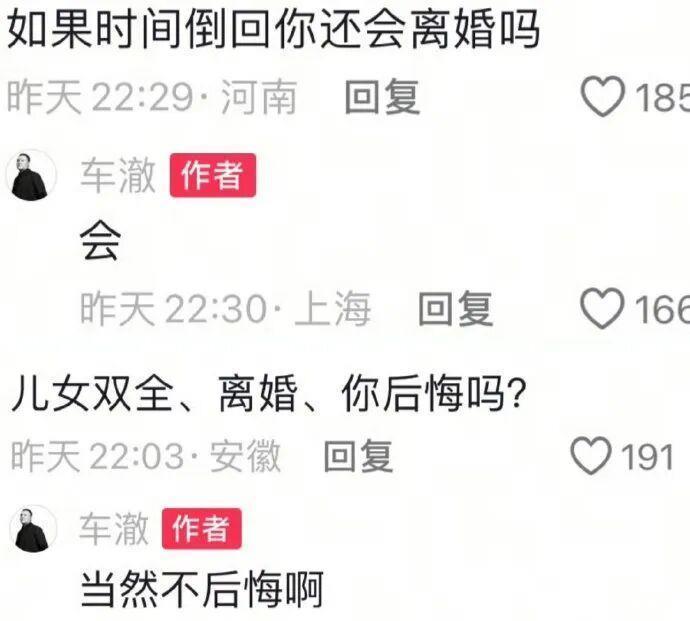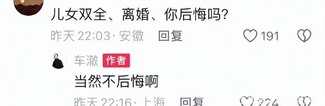 仅仅两个月后,当网友问车澈“儿女双全仍离婚是否后悔”时,他给出了直白回应:“不后悔啊”。而当被追问“时光倒流是否还会离婚”,他仅以一字“会”回答。