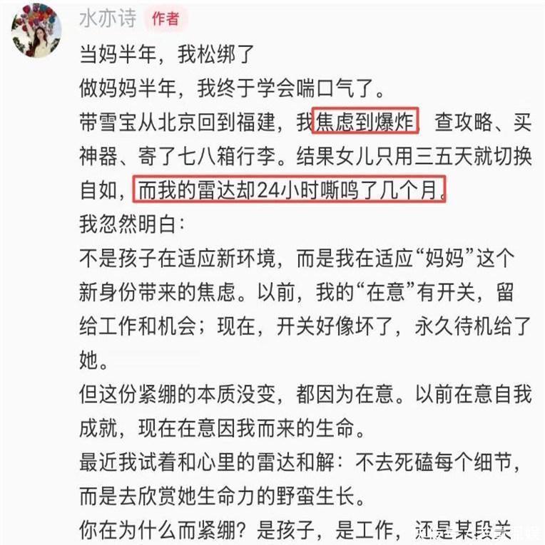 水亦诗曾思索过自己当妈后的状态,她认为这是源于对女儿的在意。她称,当妈前更关注自身成就,有了女儿雪宝后,心思全放在孩子身上。每次看到女儿冲她甜甜一笑,她就知道,这“关注雷达”这辈子怕是没法关掉了。当然,不只是水亦诗,天下当妈的大多如此,因此水亦诗的分享引起不少网友共鸣。有网友评论:“我当年更笨,除夕夜点放炮时一直给孩子捂耳朵?!?img src="http://p9.qhimg.com/t11508c75c87f6103a1330a36b8.jpg"/>