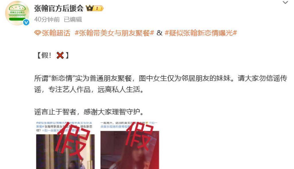 不过张翰的后援会很快出面澄清,否认新恋情曝光,称与张翰一起与好友相聚的美女是他邻居朋友家的妹妹。
