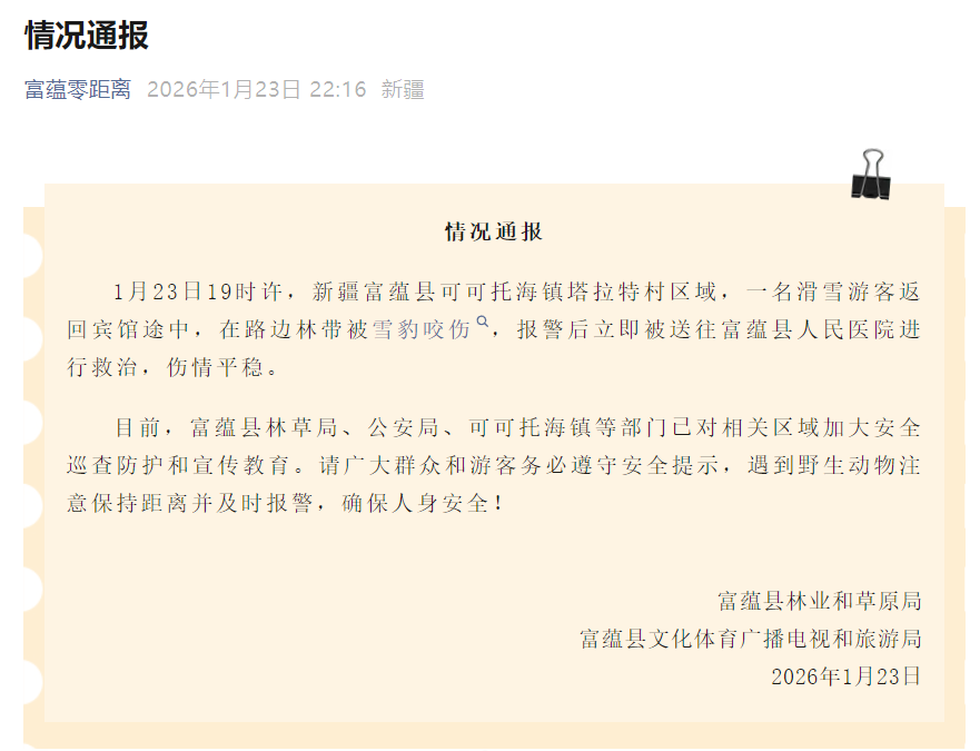1日,新疆富蕴县发布情况通报,当时许,该县可可托海镇塔拉特村,一名滑雪游客返回宾馆途中被雪豹咬伤,报警后立即送往医院救治,伤情平稳。