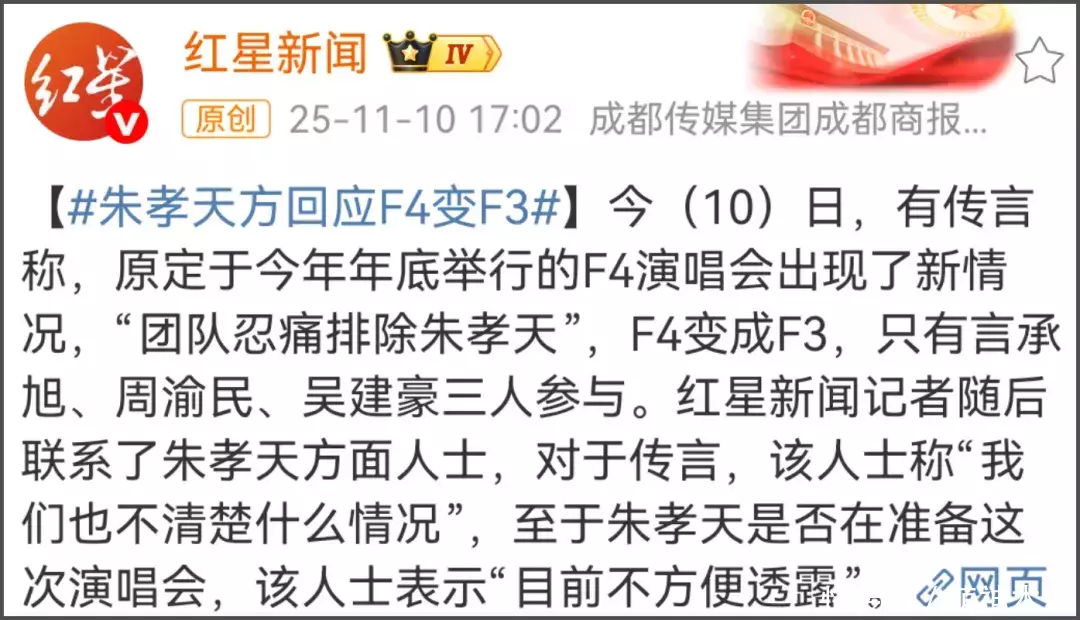 此前朱孝天在直播间直接曝光了后续F4会有单独的团体演唱会一事,还说已经在为了团体演唱会录新歌了,该说不该说的全都暴露,惹团队不满。