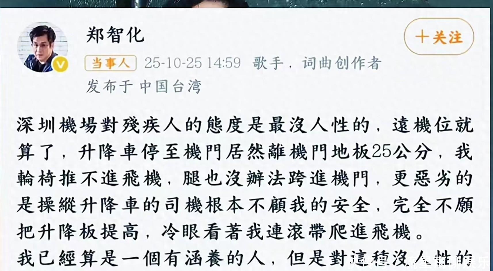 近日,歌手郑智化在社交平台发文,直言深圳机场对残疾人的态度是最没人性的。