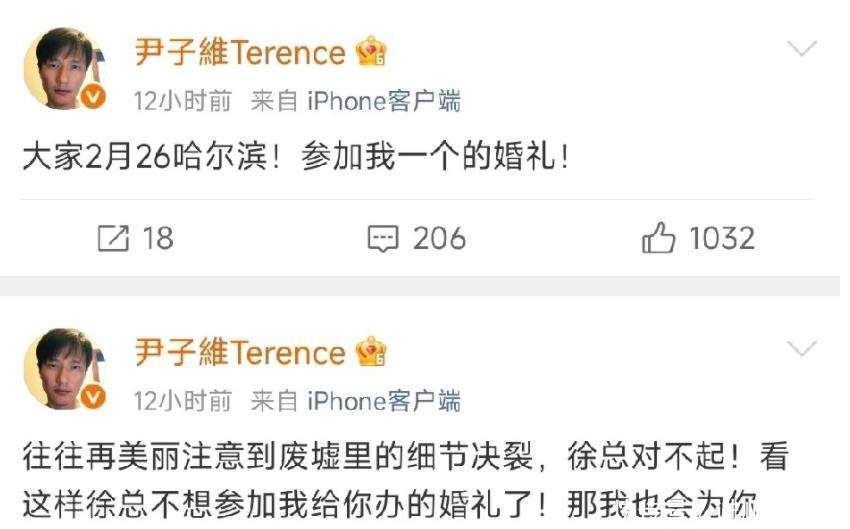 那天凌晨,尹子维在社交平台上接连发布好几条动态,尹子维没有说明具体原因,只写下“自己一个人的婚礼”和“徐总不想参加”这些话,这些内容很快被人截图转发,评论区顿时热闹起来,大家纷纷猜测原因,有人觉得是两人吵架了,有人怀疑出现了第三者,还有人认为尹子维压力太大情绪崩溃,其实这类话放在普通人身上可能无人理会,但尹子维和徐总是明星身份,明星的一言一行都容易被放大关注。