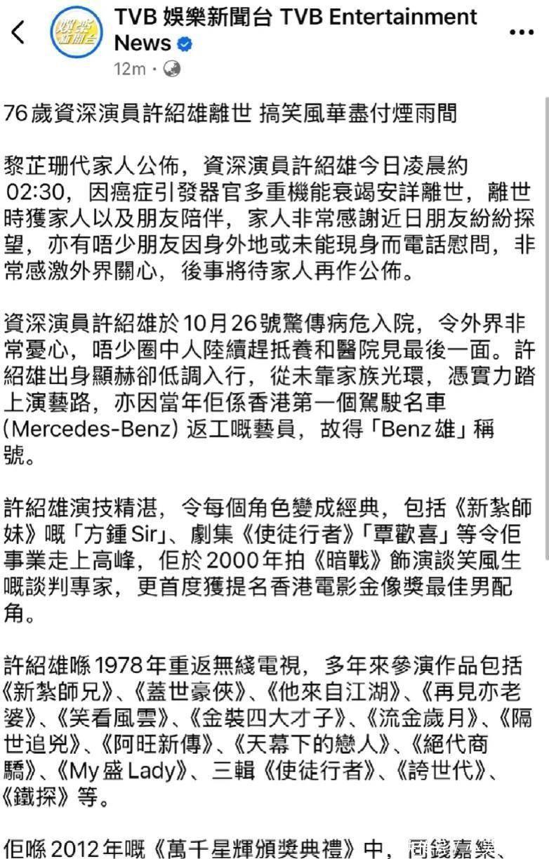许绍雄住院时,林峯和吴卓羲一同前往医院探望。在许绍雄临终前,谭耀文、郭晋安等也都急忙赶来和他见了最后一面,众人都盼着他能有好运气,可许绍雄还是没能挺过来,最终安详离世。临终前他见到了这么多好友,这一生算是没有遗憾了。再见了,“欢喜哥”。