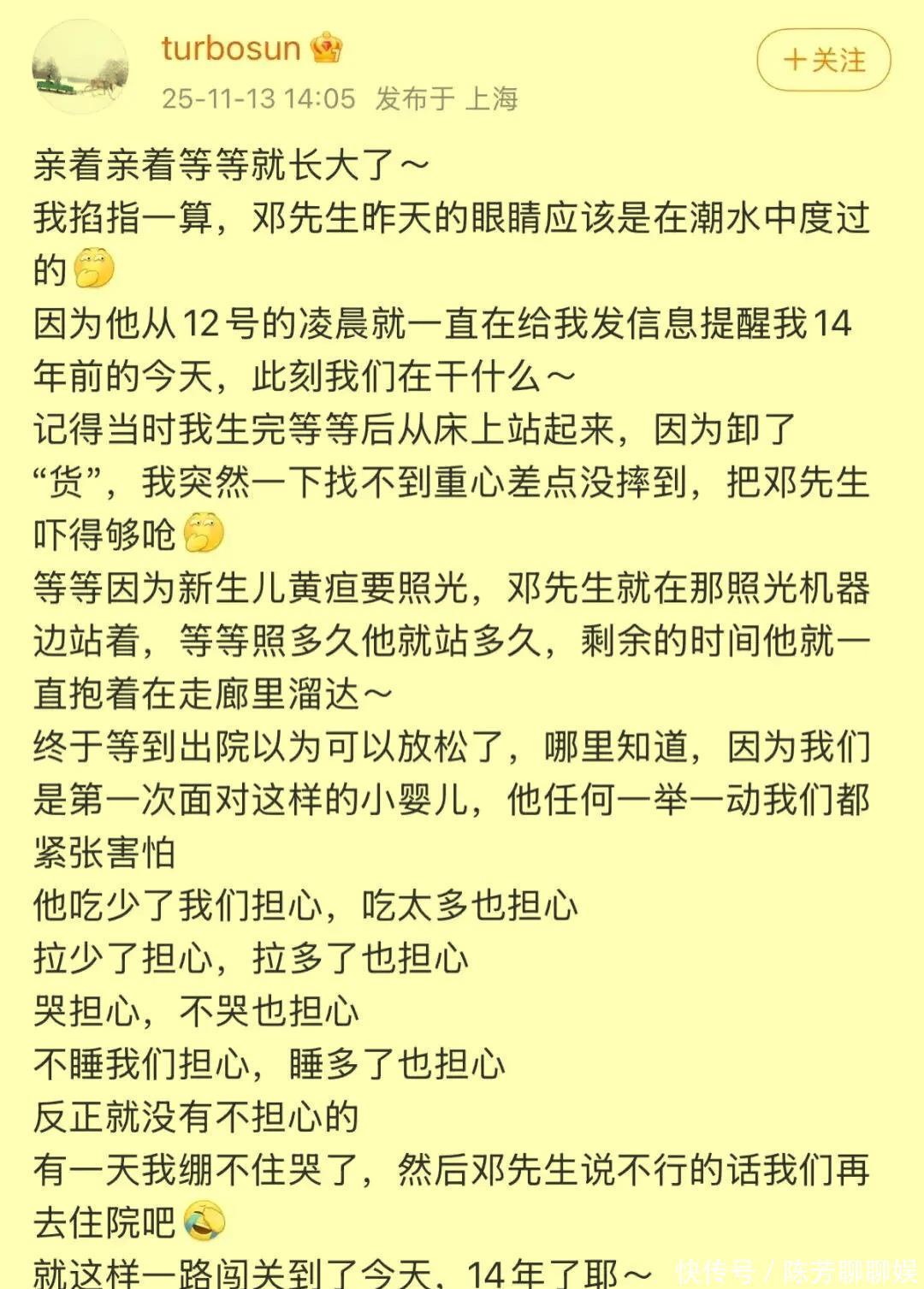 孙俪的长文以调侃邓超开篇,笑称丈日的眼睛"在潮水中度过",因为从凌晨起,邓超就不停发消息提醒年前的这一天,夫妻俩正为新生儿忙碌的点滴 。
