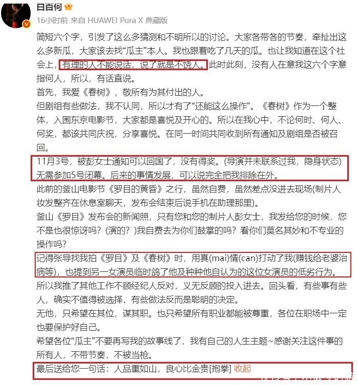 随着舆论不断升级,白百何最终选择正面回应,直接将矛头指向电影《春树》的制片方及导演团队,并通过长文倾诉自己在整个项目过程中遭遇的不公待遇和情感创伤,将积压已久的不满彻底释放。