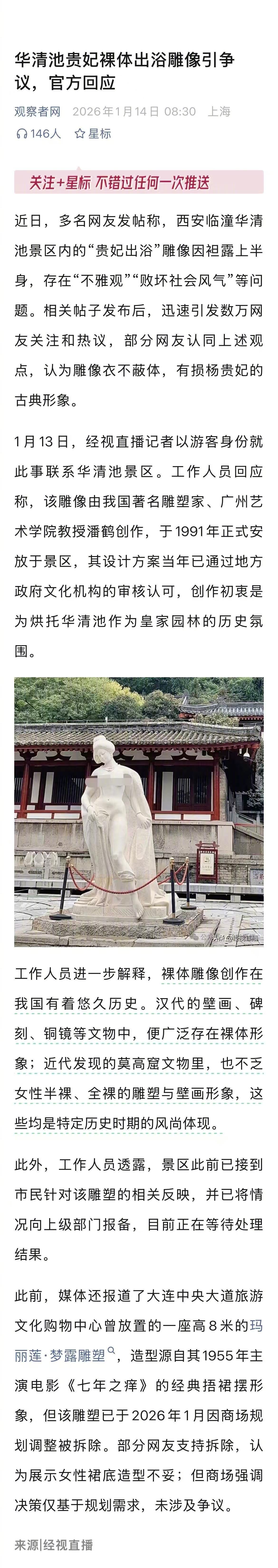 更多大道理也不说了,我诚恳希望西安市坚决顶住舆论场的这波质疑。那些“老封建”的卫道士们愿意在网上叽喳,让他们叽喳去,华清池这个存在年的贵妃出浴雕像一定要继续立在原处,这样的坚持是对从雕像立起来后过年改革开放的一份认同和敬意,是在舆论喧嚣中对开明的应有坚守。另外,这也是西安古都无愧于作为中国古老文明现代守护者的试金石。