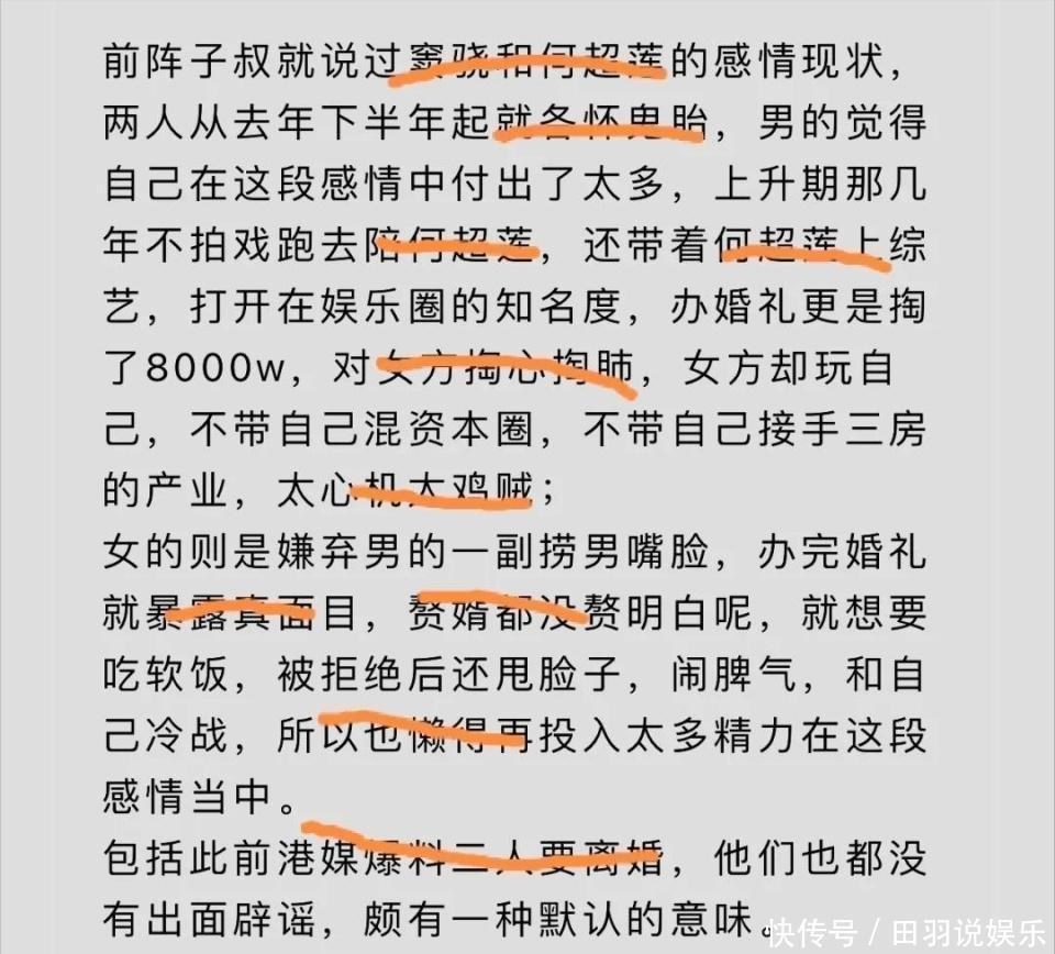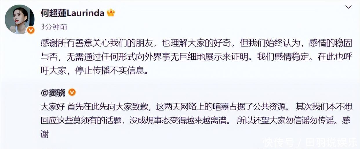 原本两人的同框就不是很多,再加上何超莲事业节节攀升的时候,感觉也没带上伴侣,这样的不平衡发展让不少人都诟病伴侣是在吃软饭,谈恋爱都专门挑有钱的谈。刚开始两人回应吧,觉得有点小题大做,不回应吧,又被网友默认分开,直到后面事情一直没平息,他们只能站出来回应澄清,称关系依旧稳固,并不需要向外界证明。