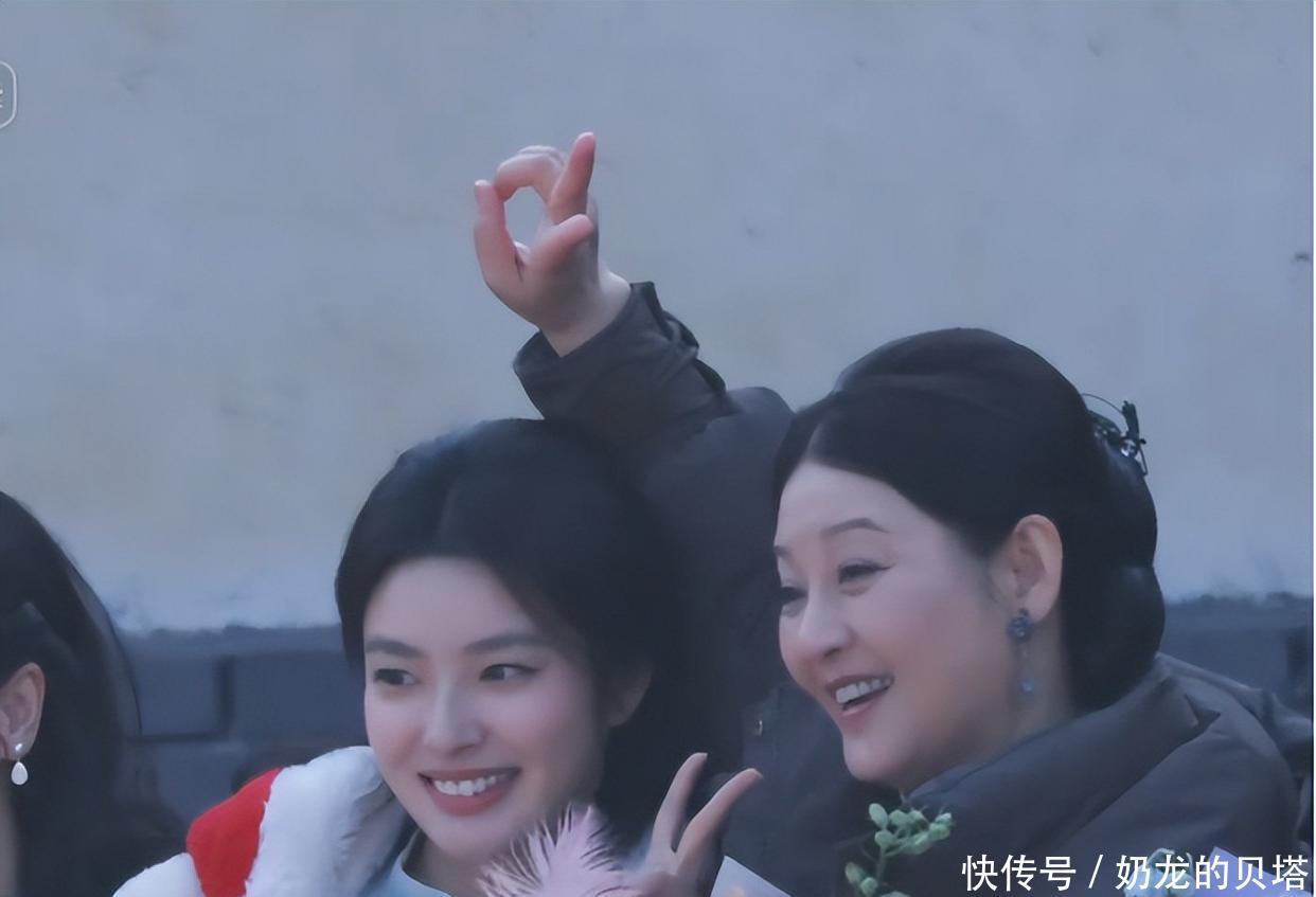 她岁啦,脸上没啥明显的皱纹,皮肤还是又紧又滑的。她里头穿了件颜色暗的旗袍,外头又披了件深色的羽绒服,整个人看着特别稳重大方。不过,当她和旁边的女演员一起拍照时,就露出了古灵精怪的一面,俩人同时比出“剪刀手”,显得特别活泼。