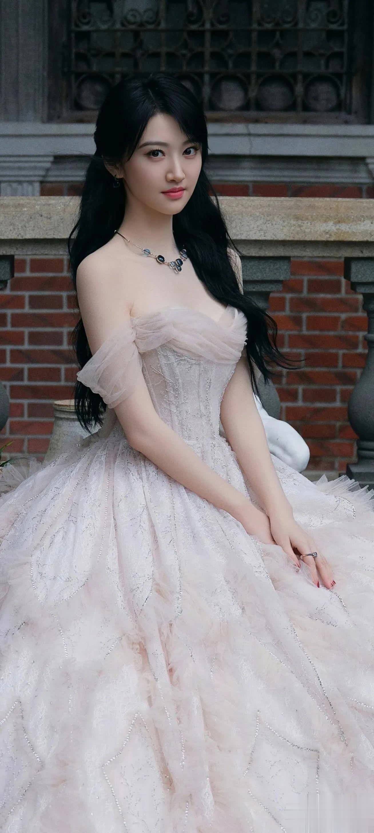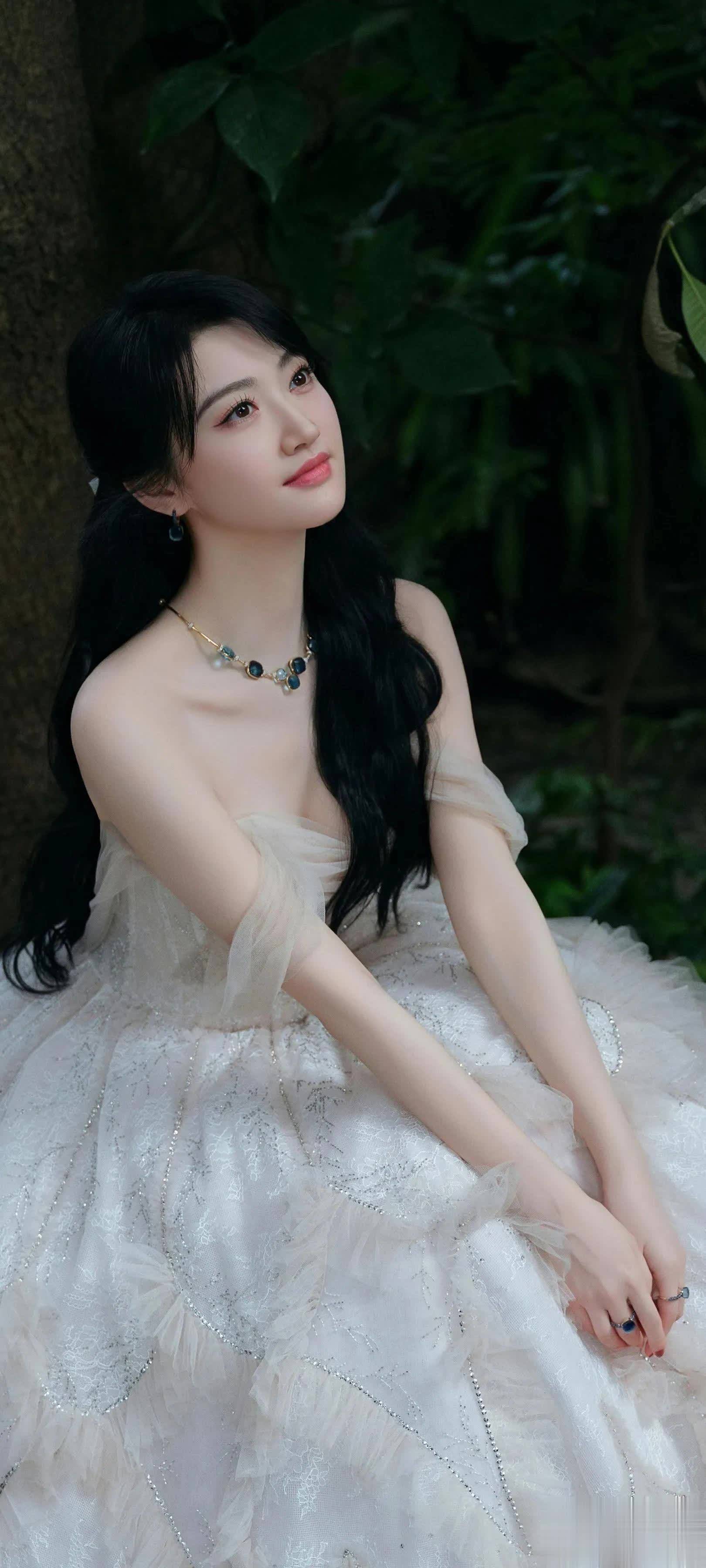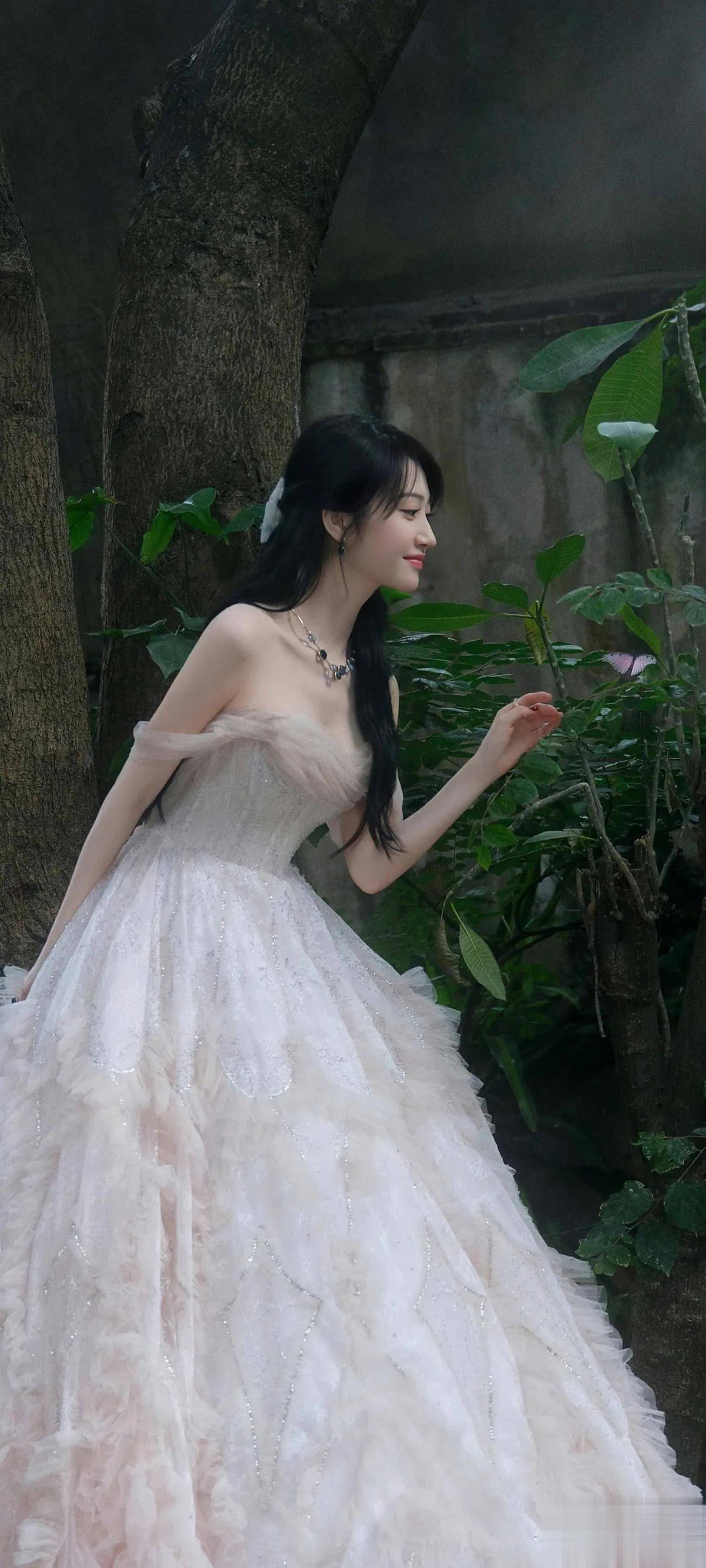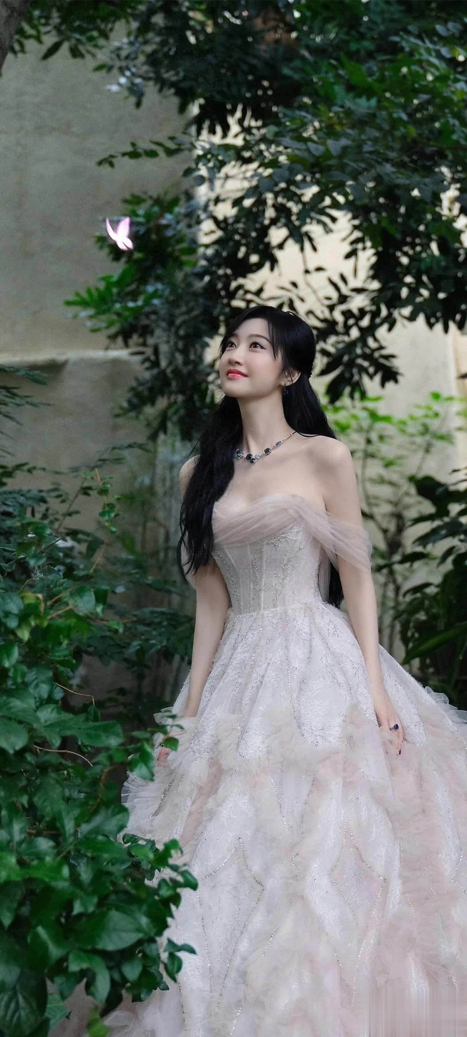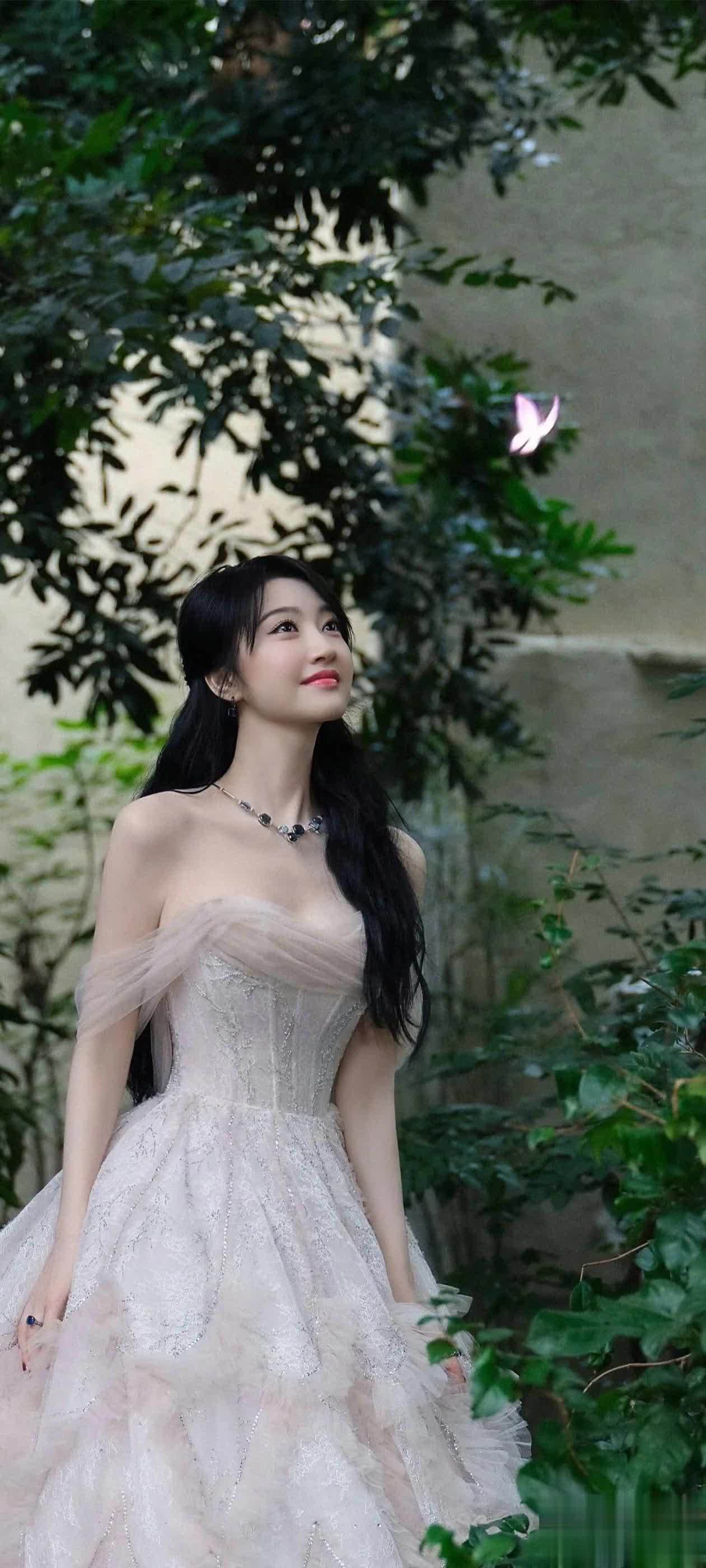 换个角度,我们能更清晰地看到裙子的细节。蓬松的裙摆层次丰富,薄纱的褶皱处理得恰到好处,营造出一种梦幻般的氛围。景甜微微仰头,眼神中透露出灵动与俏皮,仿佛在与空中的蝴蝶互动。此时,她不仅是在展示一件华服,更是在传递一种对生活的热爱与对美好的向往。