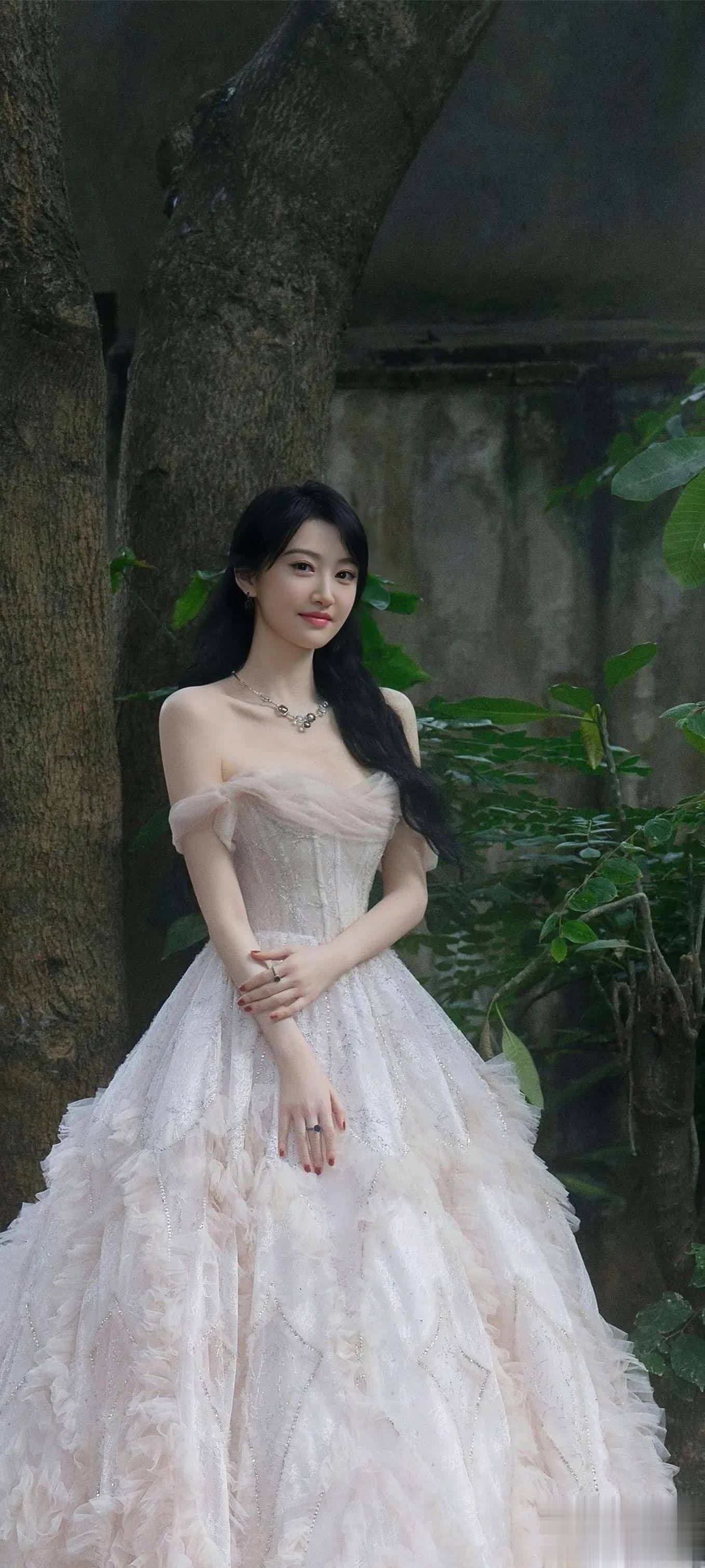 画面中,景甜身着一袭浅粉色抹胸纱裙,置身于绿意盎然的自然环境中。这条裙子采用了轻盈的纱质面料,抹胸设计巧妙地展现出她优美的肩颈线条。裙身的精致刺绣若隐若现,增添了几分华丽感。浅粉色调温柔又浪漫,与周围的绿植相互映衬,仿佛从童话中走出的公主。她的长发自然垂落,搭配上简约而精致的项链,整体造型清新又不失优雅,尽显女性的柔美。