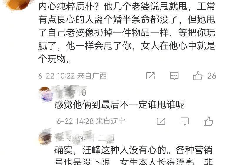 八年婚姻最终挥别汪峰虽然一直强调是自己离婚后才和森林北走到一起的,但大家对于他的这种多婚多离的做法嗤之以鼻。尤其是他离婚多时后,参加访谈节目,声称自己“找不到自己生活的激情,厌烦了生活”。网友辣评:明明是自己喜新厌旧,却说得如此高尚!离婚后的汪峰不论是事业上还是口碑上都呈现了下滑的趋势,尽管演唱会门票打折,但仍难以售罄。如今他与森林北的感情也比较稳定,两人合开公司,合体直播,但成绩一般。