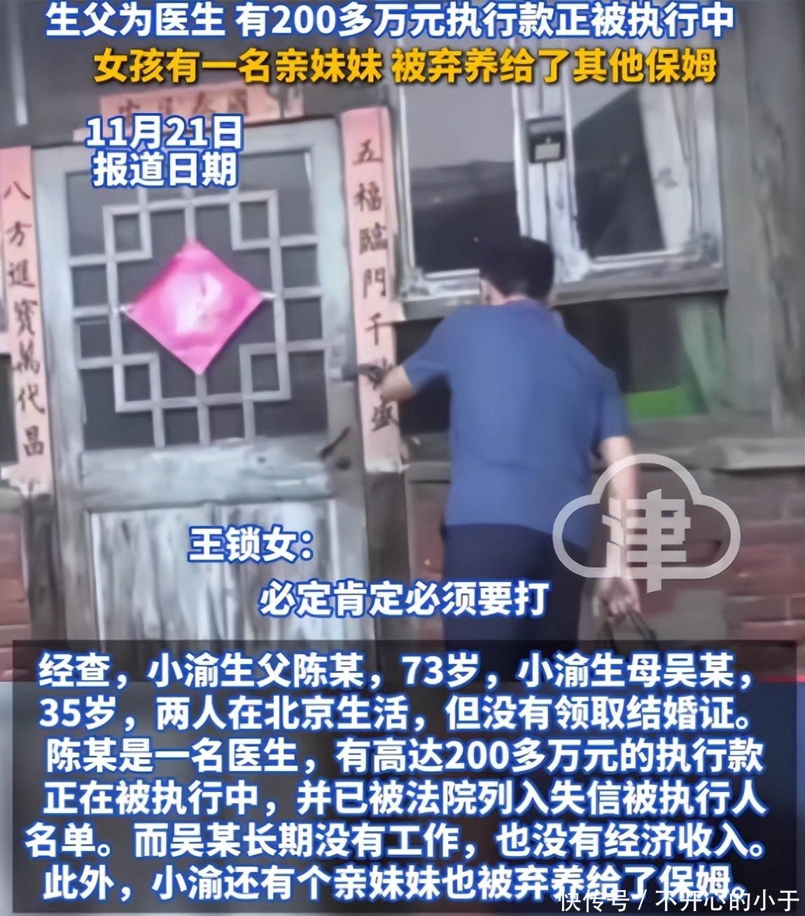 调查中,检察人员找到了小渝的生母吴某,今岁,她目前与陈某仍居住在北京郊区,但生活状况堪忧。