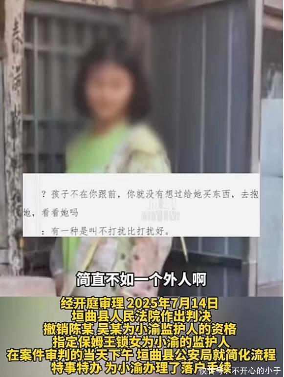 2025日,法院正式作出判决,撤销小渝原生父母的监护资格,指定王锁女为小渝的法定监护人。