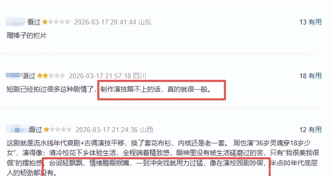 ?????? 周也那张脸确实漂亮,清冷又精致,可演技是真跟不上。自从演了魏莱之后,资源是好得让人眼红,什么题材都敢接,但除了那个反派角色,其他表现实在乏善可陈。这次演个农村出来的姑娘,本该有的那股子韧劲和青涩完全没影儿,全程表情管理像是焊死了似的。遇到难事儿看不出愁,受了委屈哭得却像在发脾气,那种拿腔拿调的劲儿,哪有一点八十年代姑娘的样子??????? 翟潇闻这边就更让人头疼了。爱豆转型演戏本来就难,他偏偏还要挑大梁演男主。角色设定是个踏实肯干、有担当的青年,可他演出来却是油头粉面,说话有气无力,眼神也飘忽不定。跟老练的配角对戏时,简直被碾压得渣都不剩,连走个路、吃顿饭都透着股刻意劲儿。不少观众调侃,看他演戏总担心下一秒他就要开口唱跳,完全没法入戏。