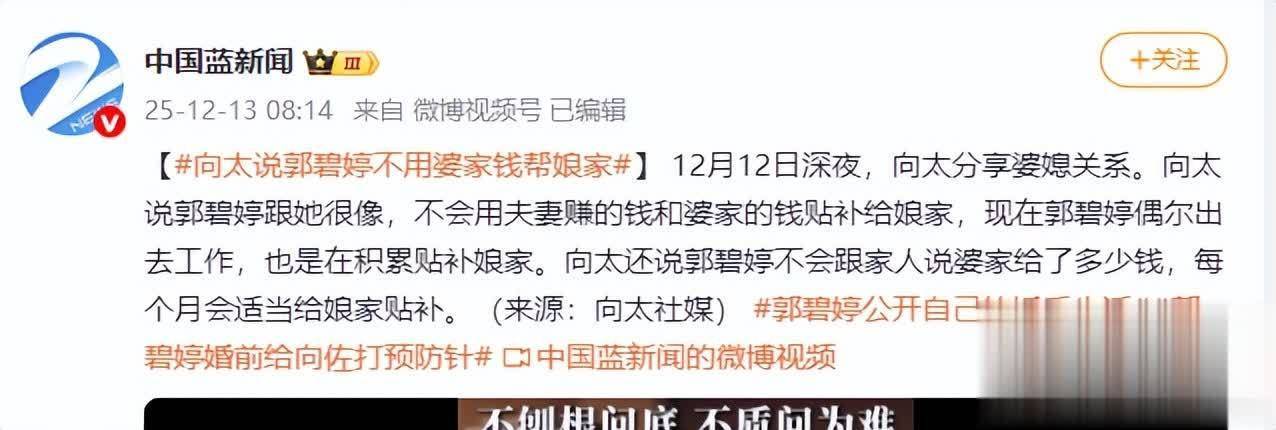 近日,向太在采访中的一句"郭碧婷跟我年轻时一模一样,从不用婆家钱帮娘家"直接引爆热搜。