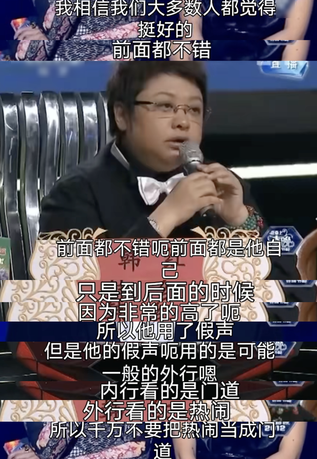 韩红则选择坚持拆穿平安背后的小心思,一句“内行看的是门道,外行看的是热闹,所以千万别把热闹当门道”,顿时让台上的董卿与平安下不来台,场面一度僵住。