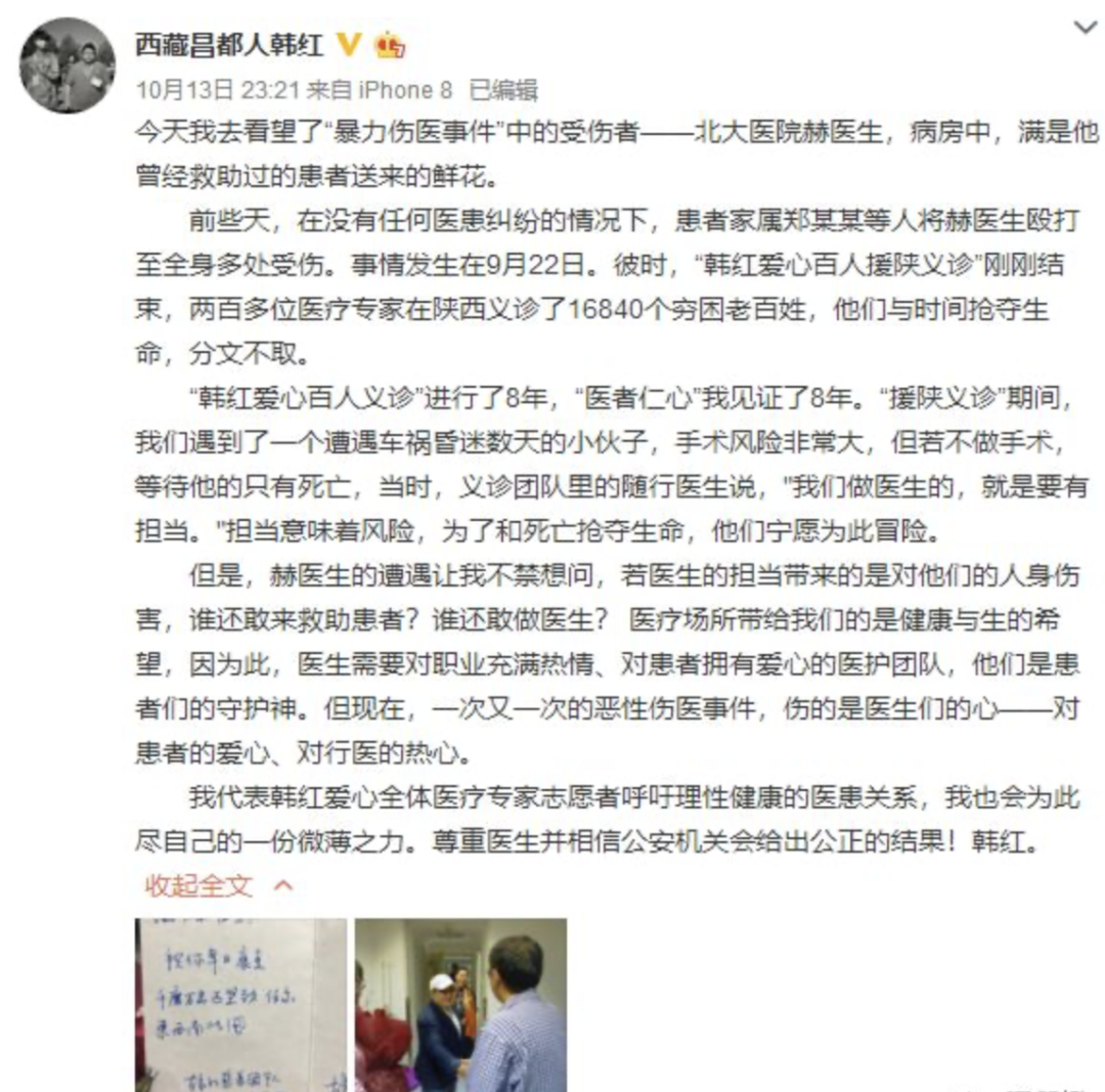 韩红,依旧是那个冲在最前头的明星,她果断站在了医生身边,公开呼吁理性健康的医患关系。