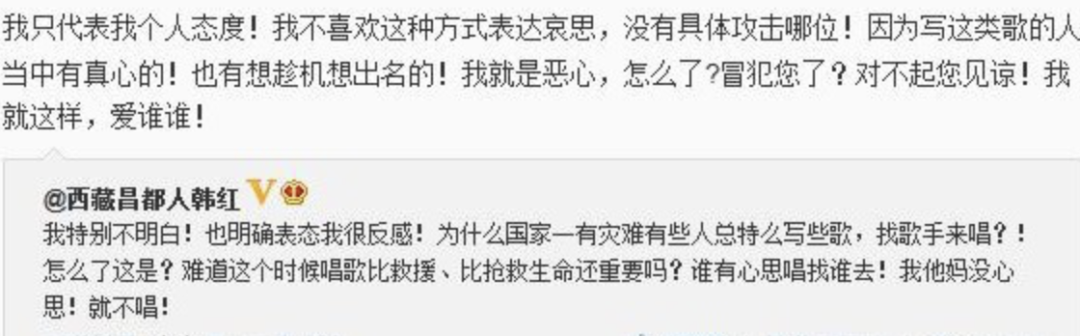 2013日,韩红突然在微博发飙,矛头直指“赈灾歌曲”,称“唱歌难道比救援还重要吗”,最后甚至还爆了一句粗口。