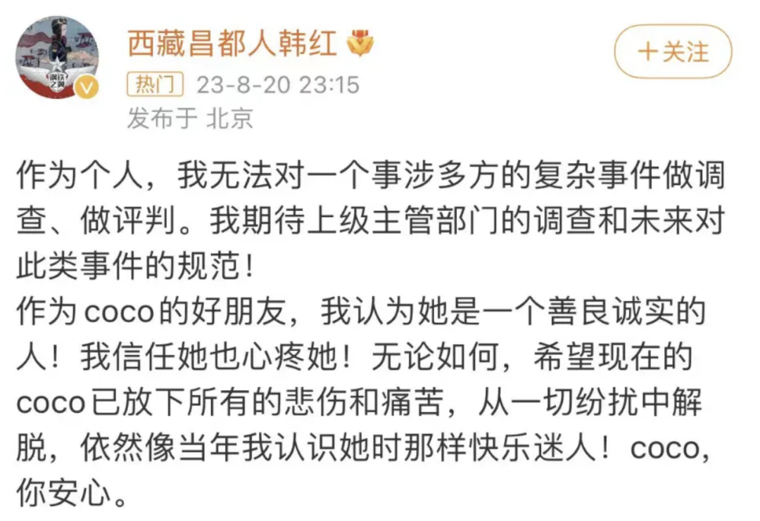 2023日晚,作为李玟好友的她,针对此事公开发了一条微博,没有激烈的情绪、也没有尖锐的话锋,只是期待一个真相。