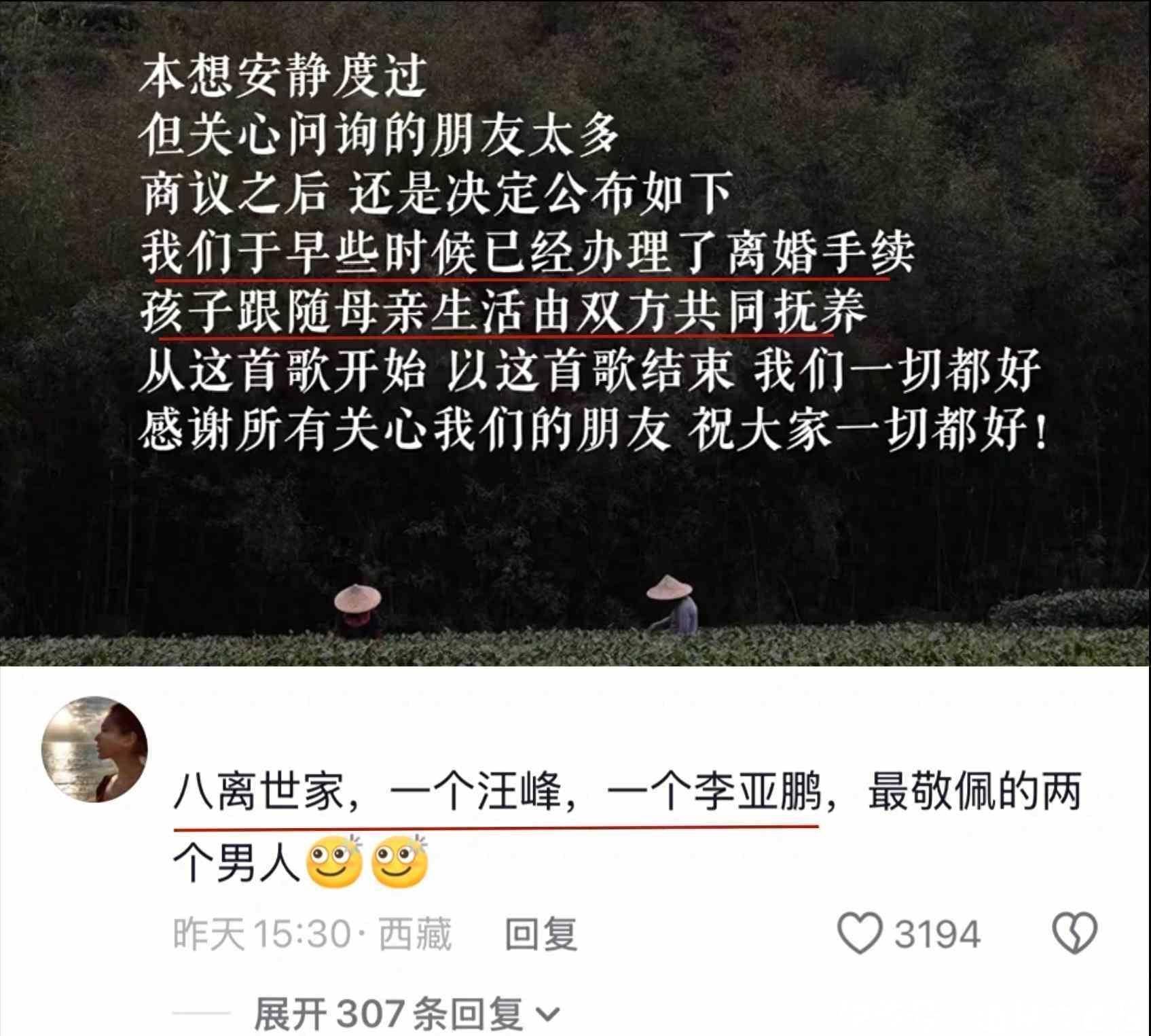 2025月,李亚鹏和小他十九岁的妻子海哈金喜离婚了,孩子跟着妈妈,两人一起带,没人说财产怎么分,只讲债务一起扛,这事没上热搜,但网上不少人开始翻他以前的感情事,有人翻日,那天王菲和李亚鹏、汪峰和康作如都发了离婚声明,网友管那天叫命运共振日,更巧的是,王菲当年在评论区回粉丝说别喜欢汪峰,现在被人翻出来当神预言,汪峰现在的女朋友森林北,也因为李亚鹏再婚又离,被莫名其妙拉进谁配得上谁的讨论里。