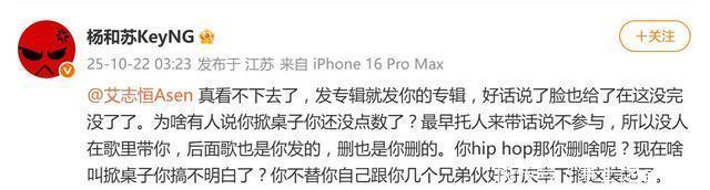 ?????? 这场隔空交锋,核心围绕Asen新专辑宣传中反复炒作的“掀桌子”话题。杨和苏毫不客气地指出:早年那场Beef中,Asen就曾托人带话表态“不参与”,因此当时无人写歌针对他。没想到,后续Asen不仅主动发歌卷入战局,发完又悄悄删除,如今却在新专里旧事重提。杨和苏直接开怼:“你HipHop那你删啥呢?现在啥叫掀桌子你搞不明白了?”更放话“这辈子不删博”,暗指对方言行不一,违背了说唱圈最看重的“Real”精神。