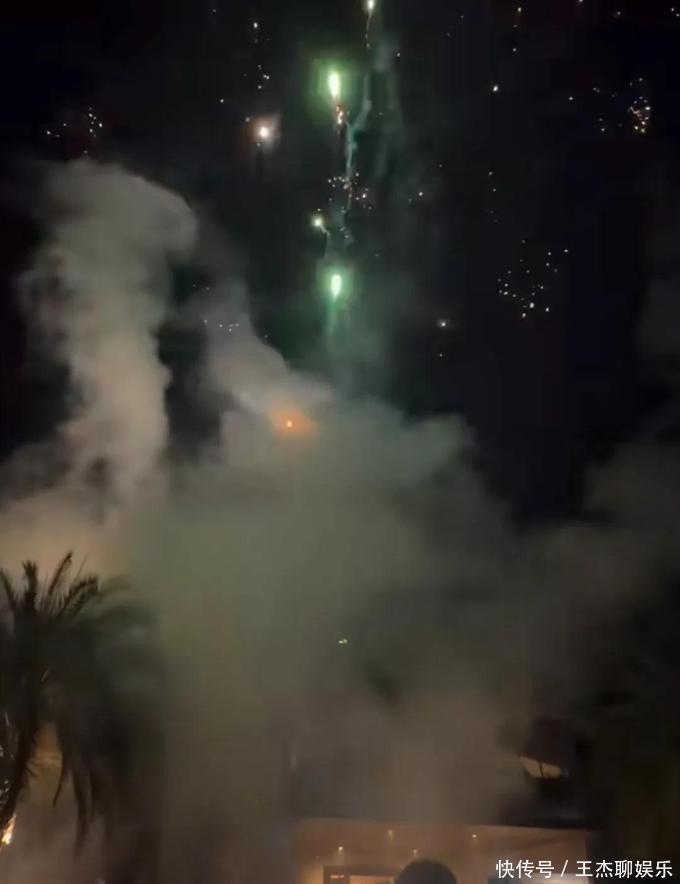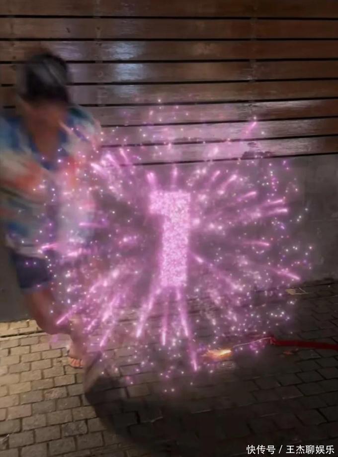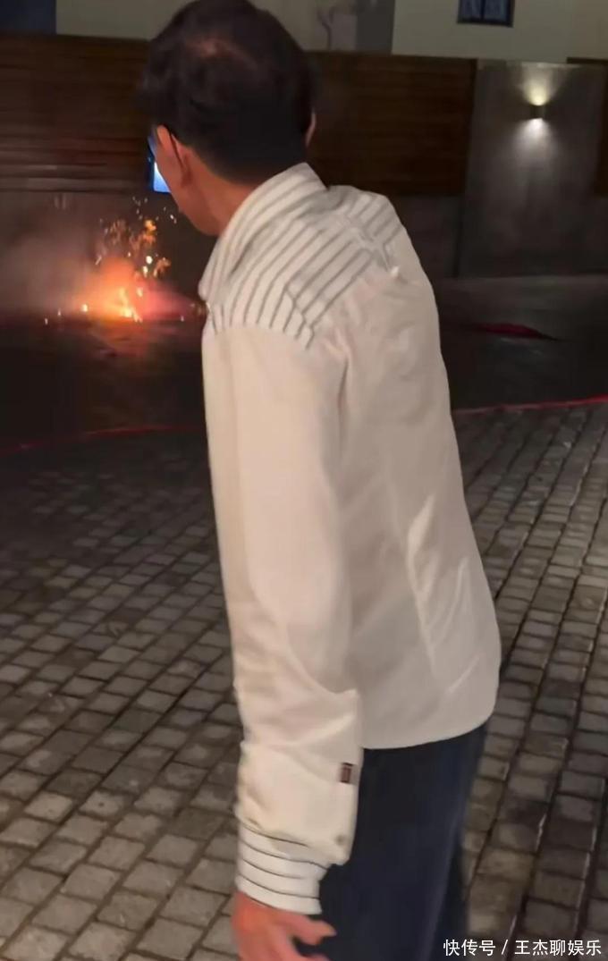 用餐结束后,吴尊的父亲在自家庭院里放鞭炮和烟花,并且还拿出手机进行录像。