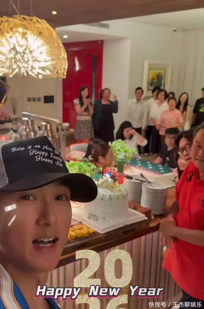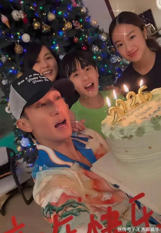 全家人手持装数字的蛋糕,兴高采烈地自拍。从画面中可以看出,女儿更像是爸爸,而儿子则更像妈妈。他们的脸型都是瓜子形,眉宇之间流露出凤目的大方,整体颜值相当高。