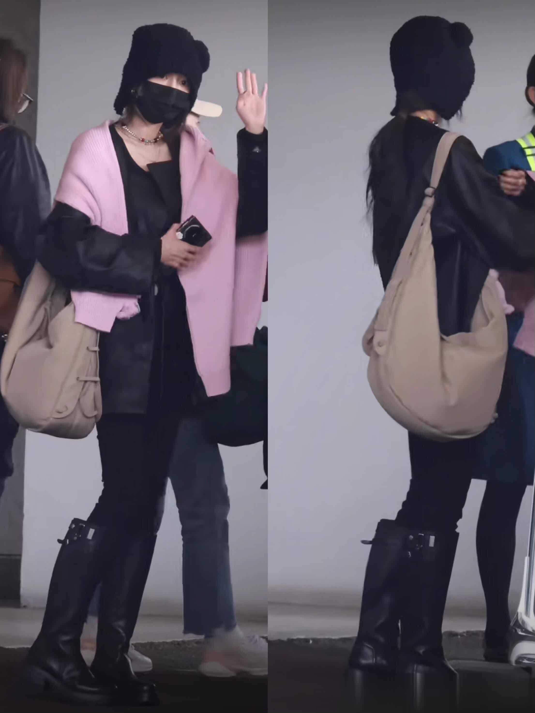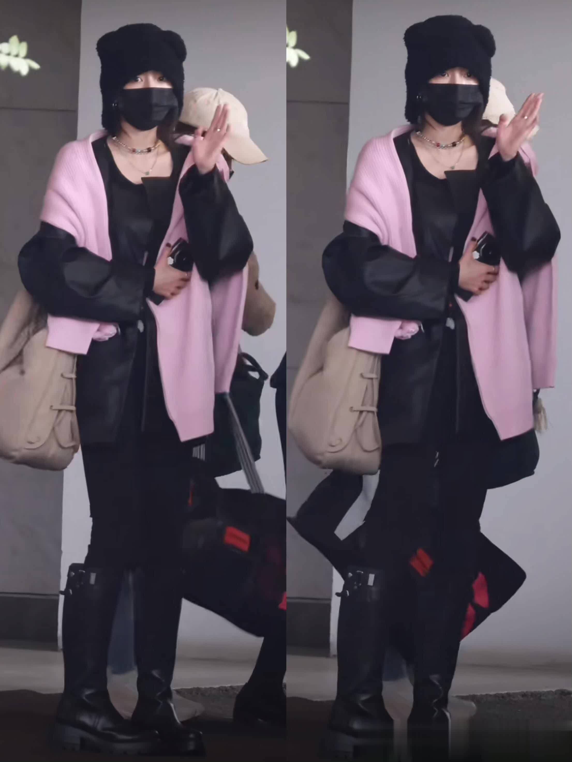 杨幂这穿搭太绝了 粉黑撞色+小熊帽 甜酷少女感拉满 走机场都像拍大片