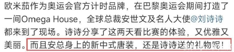 早年巴黎奥运会期间,身为欧米茄品牌大使的她,便曾亲手赠予品牌总裁安世文一套全新中式唐装。