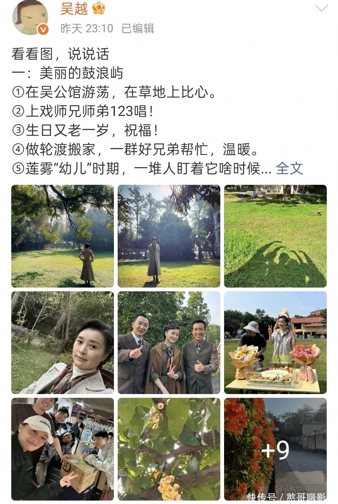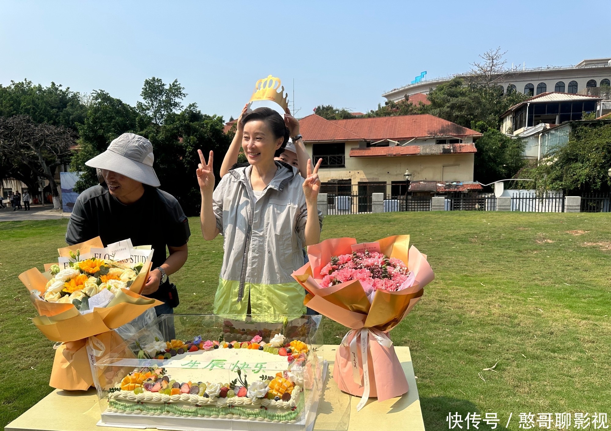 吴越的气质是真的好好,于和伟的气质也是,很欢乐的剧组。吴越岁生日,也有鲜花生日蛋糕作伴。吴越站在生日蛋糕前,头戴生日皇冠,双手比耶,看起来就很开心。