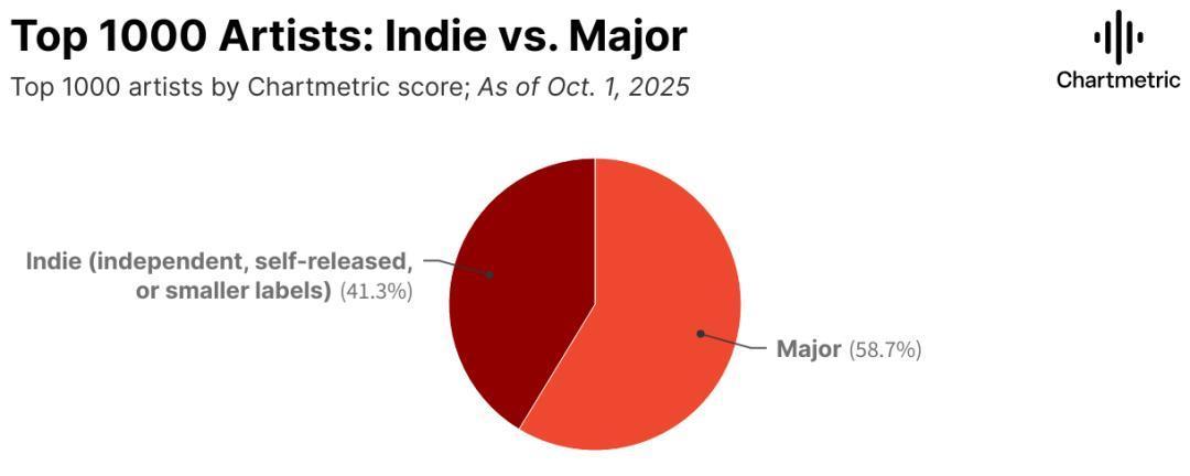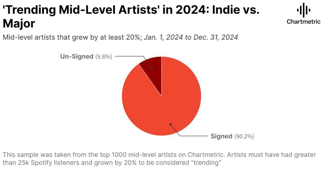 比如,Chartmetric数据显示,在排名中腰部区间(12k–35k)且年实现了至%增长的艺术家中,超%都是独立音乐人,而来自大厂牌的只占不%。