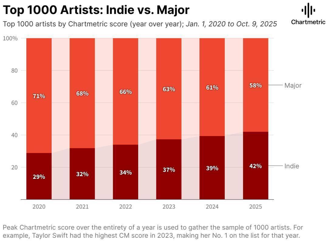 如今独立音乐与主流音乐的份额已逐渐趋近,生态格局也随之发生转向。艺术家在签下合约之前,就能先以“小型媒体组织”的姿态完成自我启动,创作、发布、传播、社群经营一体化运作。