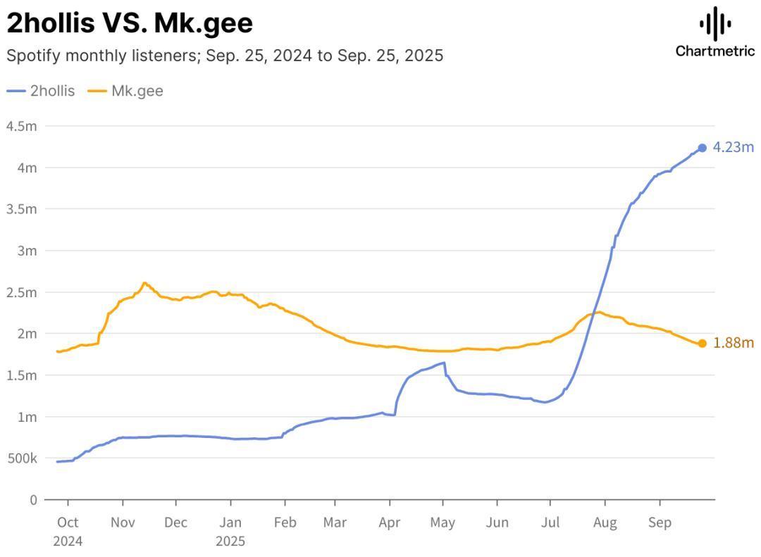 有意思的是,从数据上看,2hollis的增长速度显然更快。如图所示,年,2hollis的月度听众万,明显低于Mk.gee万左右。然而,到月,2hollis的月度听众数大幅增长,突万,尽管没有行业背书,他的表现依然远远超过了Mk.gee。