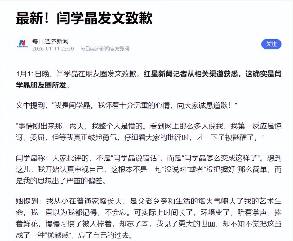 16. 闫学晶通过私人朋友圈发布长文致歉,开篇即写道: