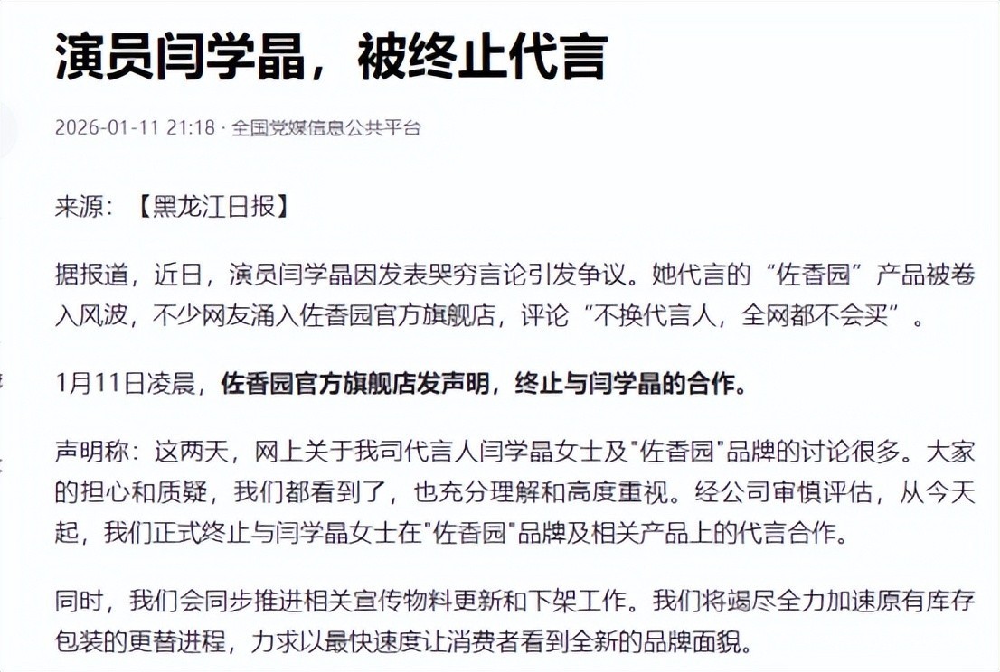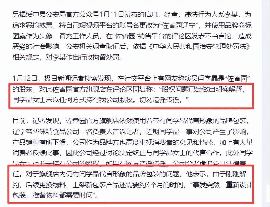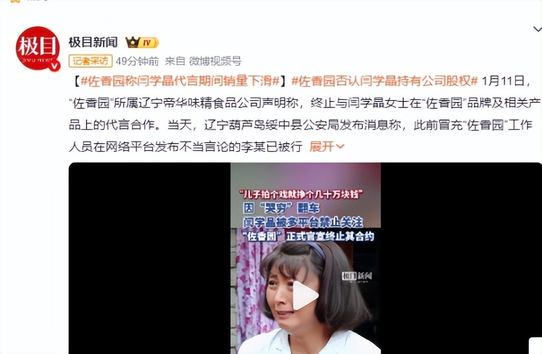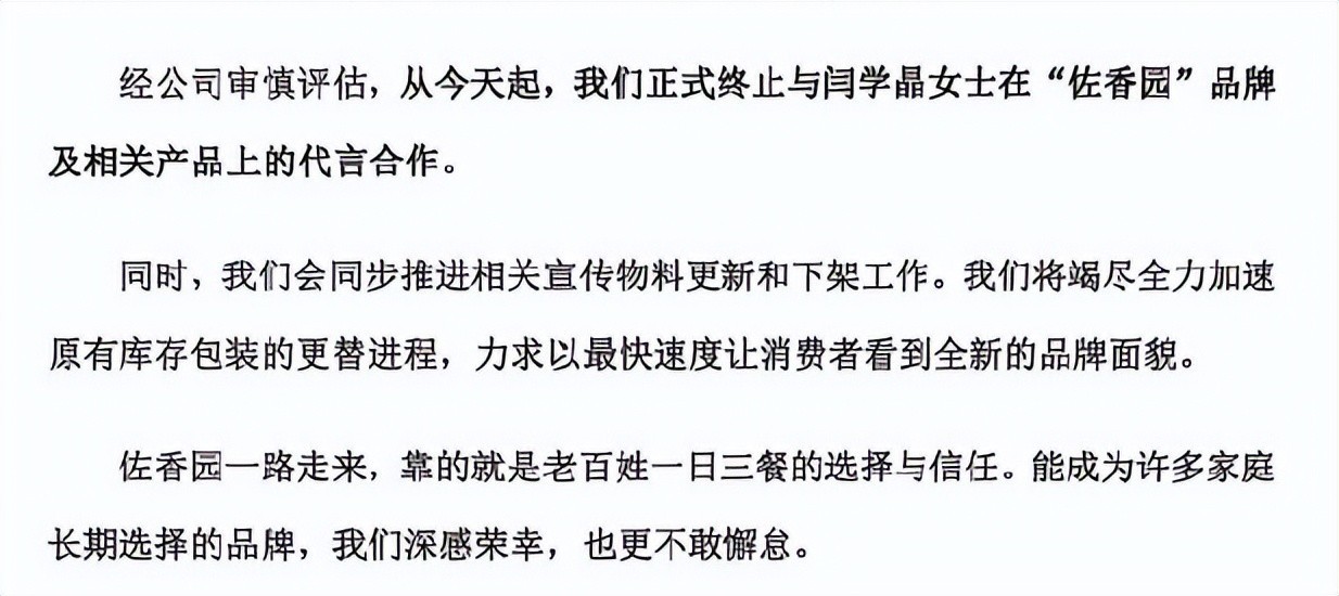 41. 佐香园在舆论压力下迅速发布声明,宣布与闫学晶解除代言关系,动作干脆利落。