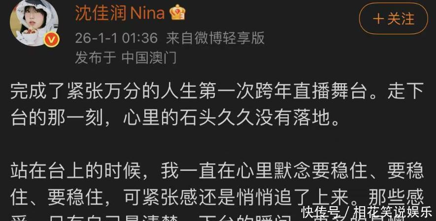 其实这些只是今年跨年晚会上的冰山一角。真正让网友炸锅的,是沈佳润的表演。前阵子因为一首《美美桑内》在网上火得不要不要的,人设一度被捧成新晋“星二代”代表,业内外夸了个遍。但是江苏卫视舞台上她和毛不易合作《不染》,一张嘴直接抢拍,第一句唱完就开始大跑调。热搜瞬间被“沈佳润跑调”“沈佳润紧张到哭”等词条攻占,网友吐槽水平根本配不上上台,甚至觉得毛不易自己单独唱效果还更好。后面沈佳润也光速发文道歉,说对不起影响了同伴,也谢谢宽容的粉丝承诺以后多练习,争取下一次上台拿出点成果。她爸小沈阳也挺坦率,不护短,直接喊以后继续加油。